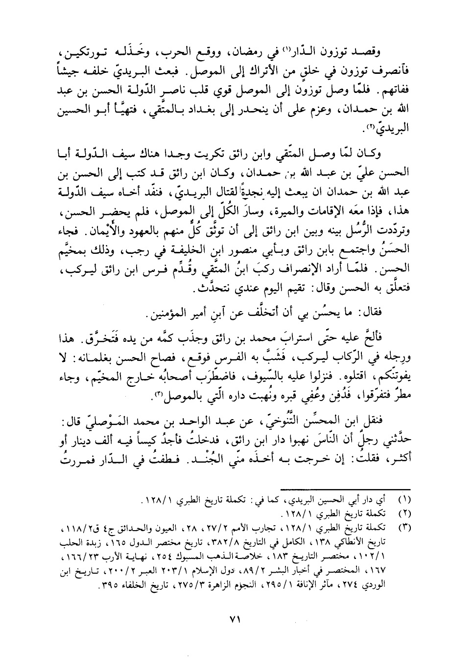 [3] تكملة تاريخ الطبري 1/ 128، تجارب الأمم 2/ 27، 28، العيون والحدائق ج 4 ق 2/ 118، تاريخ الأنطاكي 138، الكامل في التاريخ 8/ 382، تاريخ مختصر الدول 165، زبدة الحلب 1/ 102، مختصر التاريخ 183، خلاصة الذهب المسبوك 254، نهاية الأرب 23/ 166، 167، المختصر في أخبار البشر 2/ 89، دول الإسلام 1/ 203 العبر 2/ 200، تاريخ ابن الوردي 274، مآثر الإنافة 1/ 295، النجوم الزاهرة 3/ 275، تاريخ الخلفاء 395.