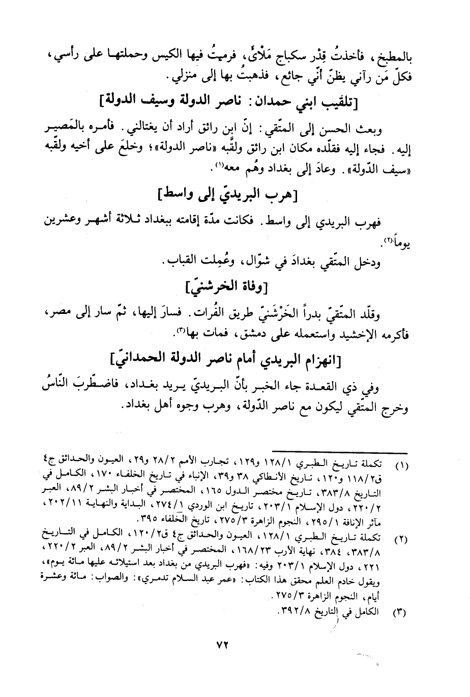 [2] تكملة تاريخ الطبري 1/ 128، العيون والحدائق ج 4 ق 2/ 120، الكامل في التاريخ 8/ 383، 384، نهاية الأرب 23/ 168، المختصر في أخبار البشر 2/ 89، العبر 2/ 220، 221، دول الإسلام 1/ 203 وفيه: «فهرب البريدي من بغداد بعد استيلائه عليها مائة يوم» ، ويقول خادم العلم محقق هذا الكتاب: «عمر عبد السلام تدمري» : والصواب: مائة وعشرة أيام، النجوم الزاهرة 3/ 275.