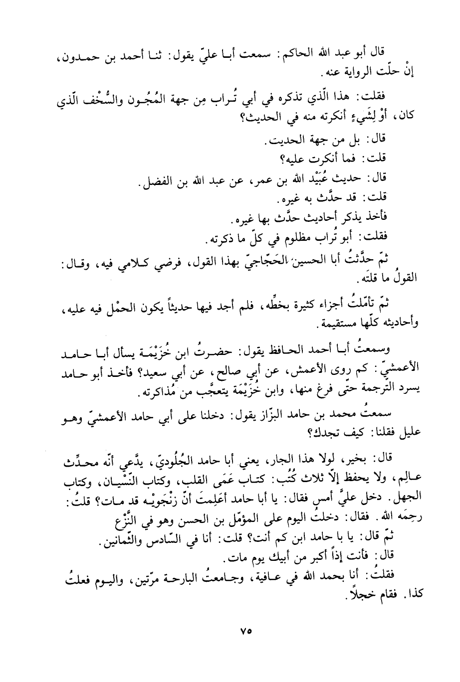 قال: بخير، لولا هذا الجار، يعني أبا حامد الجلودي، يدعي أنّه محدّث عالم، ولا يحفظ إلّا ثلاث كتب: كتاب عمى القلب، وكتاب النسيان، وكتاب الجهل. دخل عليّ أمس فقال: يا أبا حامد أعلمت أن زنجويه قد مات؟ قلت: