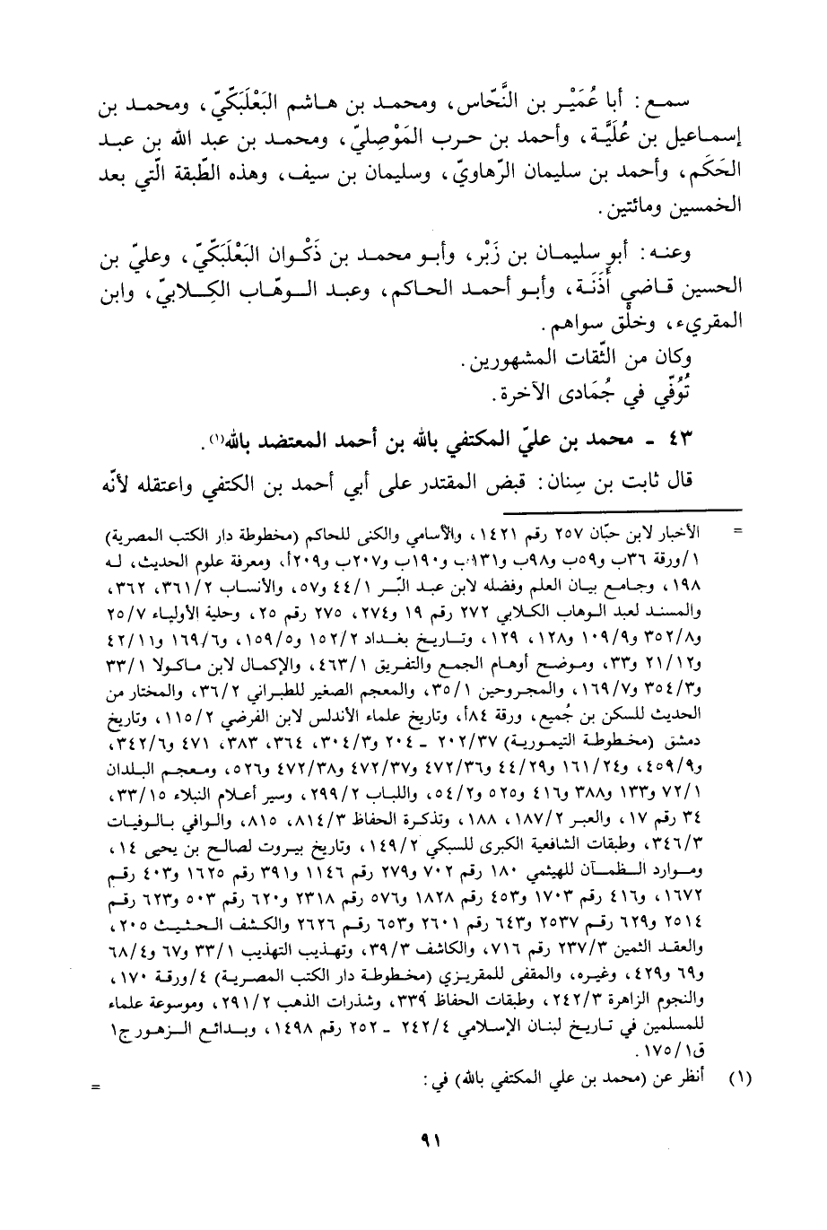 قال ثابت بن سِنان: قبض المقتدر على أبي أحمد بن الكتفي واعتقله لأنّه