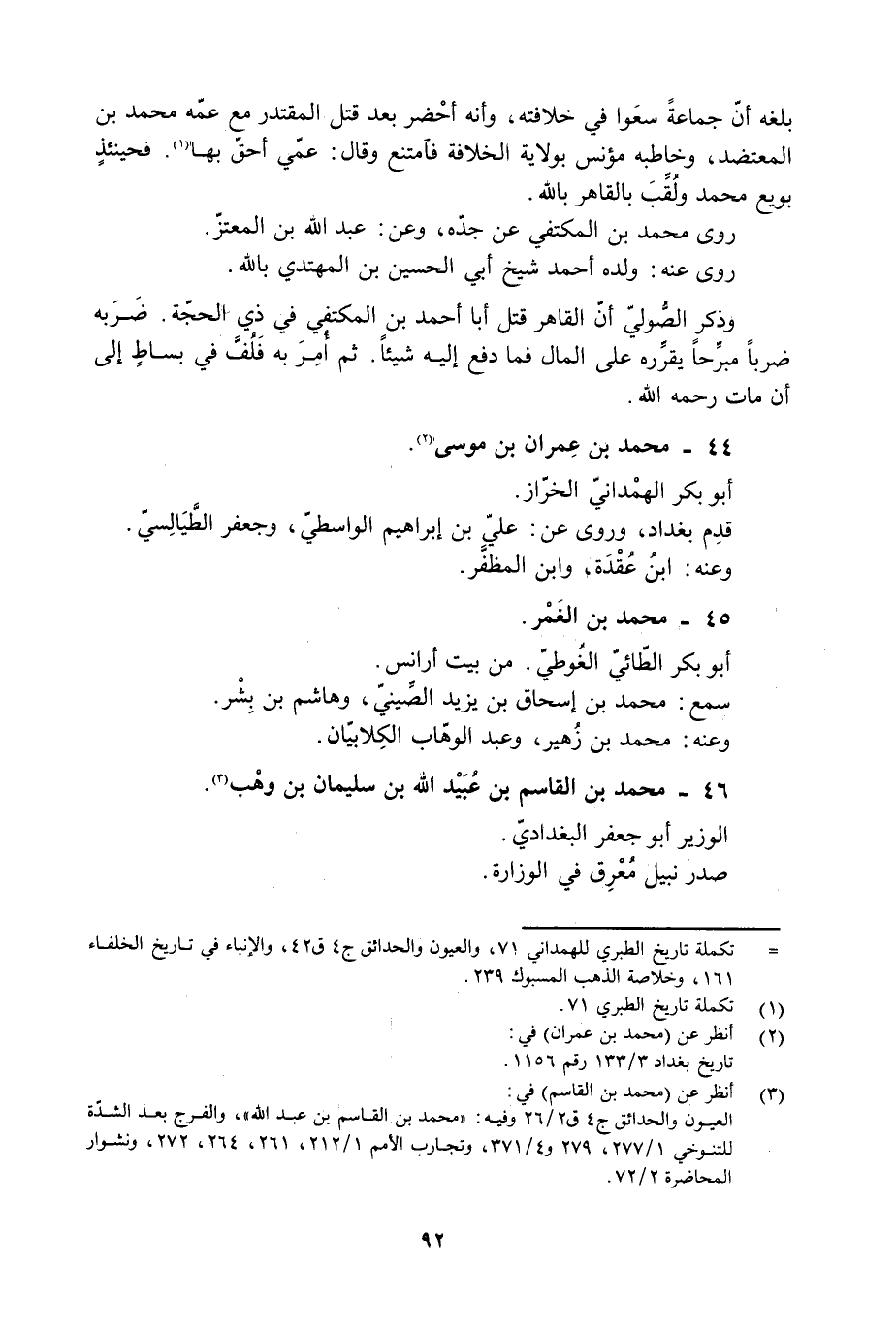 [ (-) ] تكملة تاريخ الطبري للهمداني 71، والعيون والحدائق ج 4 ق 42، والإنباء في تاريخ الخلفاء 161، وخلاصة الذهب المسبوك 239.