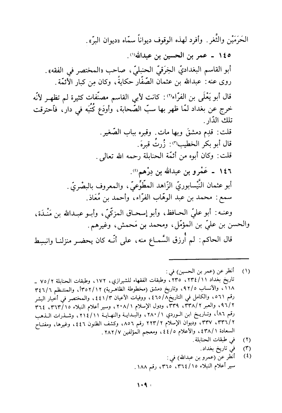 تاريخ بغداد 11/ 234، 235، وطبقات الفقهاء للشيرازي، 172، وطبقات الحنابلة 2/ 75- 118، والأنساب 5/ 92، وتاريخ دمشق (مخطوطة الظاهرية) 12/ 352 أ، والمنتظم 6/ 346 رقم 561، والكامل في التاريخ 8/ 465، ووفيات الأعيان 3/ 441، والمختصر في أخبار البشر 2/ 96، والعبر 2/ 338، 339، ودول الإسلام 1/ 208، وسير أعلام النبلاء 15/ 363، 364 رقم 86 أ، وتاريخ ابن الوردي 1/ 280، والبداية والنهاية 11/ 214، وشذرات الذهب 2/ 336، 337، وديوان الإسلام 2/ 223 رقم 856، وكشف الظنون 446، وغيرها، ومفتاح السعادة 1/ 438، والأعلام 5/ 44، ومعجم المؤلفين 7/ 282.