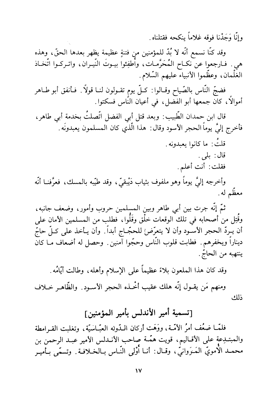 قال ابن حمدان الطّبيب: وبعد قتل أبي الفضل اتصلتً بخدمة أبي طاهر، فأخرج إلي يومًا الحجر الأسود وقال: هذا الذي كان المسلمون يعبدونهَ.