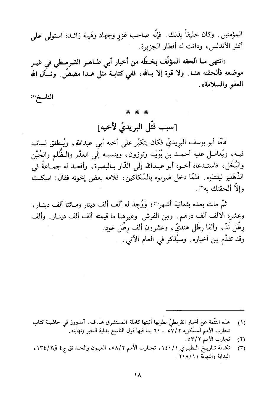 [1] هذه التتمّة عن أخبار القرمطيّ بطولها أثبتها كاملة المستشرق هـ. ف. آمدروز في حاشية كتاب تجارب الأمم لمسكويه 2/ 57- 60 بما فيها قول الناسخ بداية الخبر ونهايته.