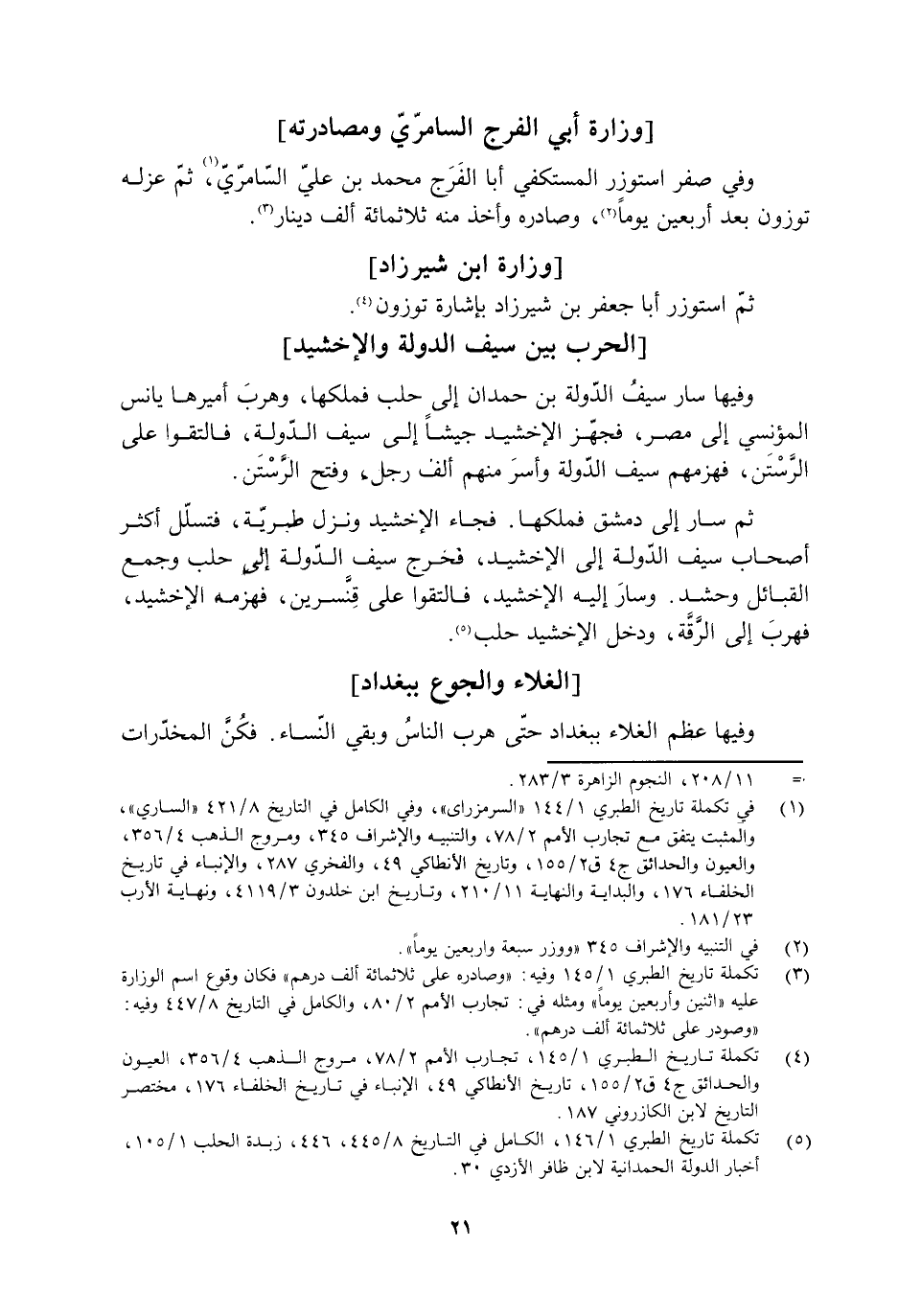 [5] تكملة تاريخ الطبري 1/ 146، الكامل في التاريخ 8/ 445، 446، زبدة الحلب 1/ 105، أخبار الدولة الحمدانية لابن ظافر الأزدي 30.