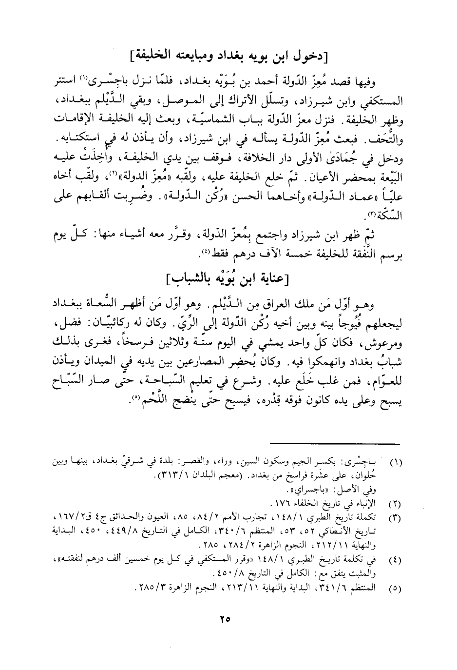 ثمّ ظهر ابن شيرزاد واجتمع بمُعزّ الدّولة، وقرر معه أشياء منها: كلّ يوم برسم النَّفقة للخليفة خمسة آلاف درهم فقط [4] .