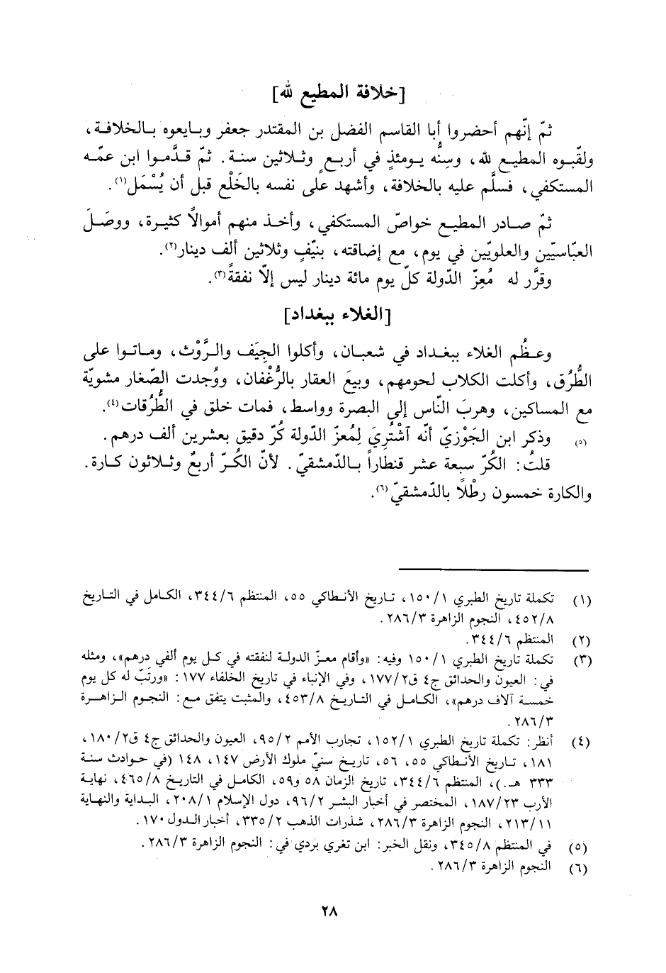 [3] تكملة تاريخ الطبري 1/ 150 وفيه: «وأقام معزّ الدولة لنفقته في كل يوم ألفي درهم» ، ومثله في: العيون والحدائق ج 4 ق 2/ 177، وفي الإنباء في تاريخ الخلفاء 177: «ورتّب له كل يوم خمسة آلاف درهم» ، الكامل في التاريخ 8/ 453، والمثبت يتفق مع: النجوم الزاهرة 3/ 286.