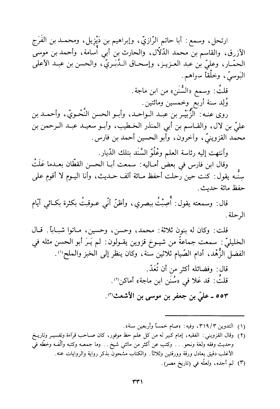 قلت: وكان لَهُ بنون ثلاثة: محمد، وحسن، وحسين، ماتوا شبابًا. قَالَ الخليليّ: سَمِعْتُ جماعةً من شيوخ قزوين يقولون: لم يَر أَبُو الحسن مثله في الفضل الزّهد، أدام الصّيام ثلاثين سنة، وكان ينظر إلى الخبز والملح [1] .