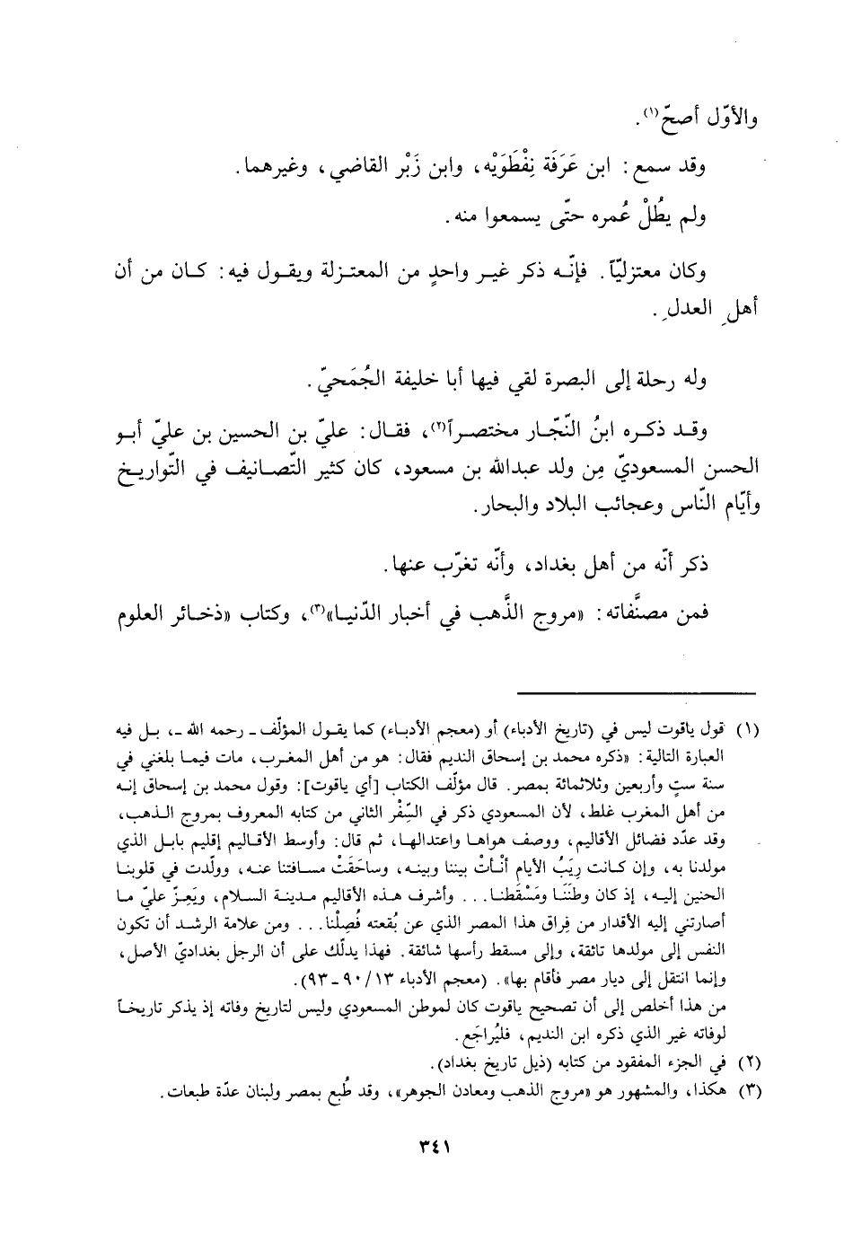 من هذا أخلص إلى أن تصحيح ياقوت كان لموطن المسعودي وليس لتاريخ وفاته إذ يذكر تاريخا لوفاته غير الّذي ذكره ابن النديم، فليراجع.
