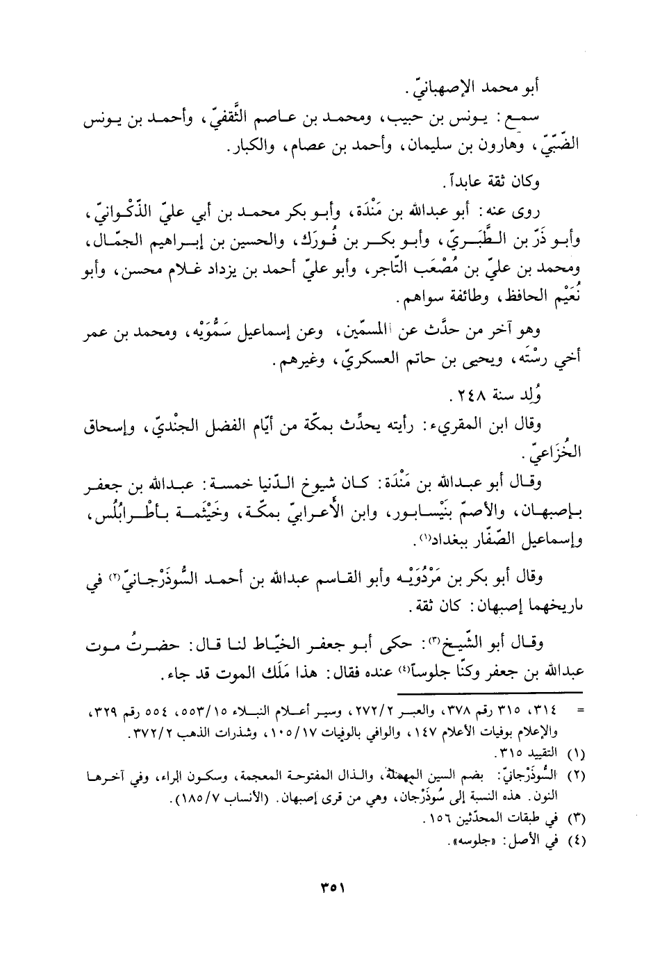 [2] السّوذرجانيّ: بضم السين المهملة، والذال المفتوحة المعجمة، وسكون الراء، وفي آخرها النون. هذه النسبة إلى سوذرجان، وهي من قرى أصبهان. (الأنساب 7/ 185) .
