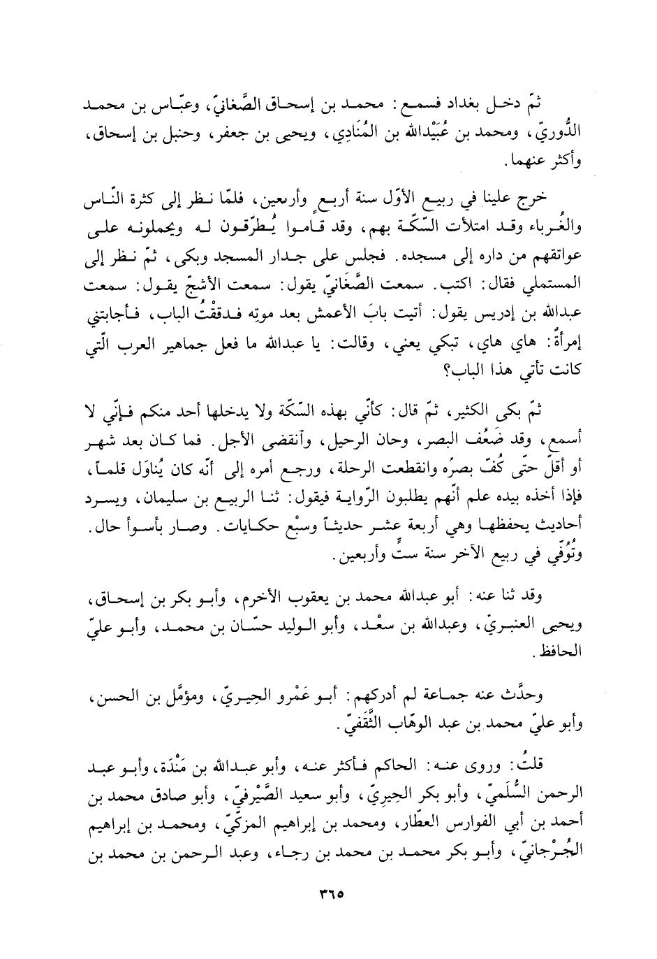 ثمّ دخل بغداد فسمع: محمد بْن إِسْحَاق الصَّغانيّ، وعباس بْن محمد الدُّوريّ، ومحمد بْن عُبَيد اللَّه بْن المنادي، ويحيى بْن جعْفَر، وحنبل بْن إِسْحَاق، وأكثر عَنْهُمَا.