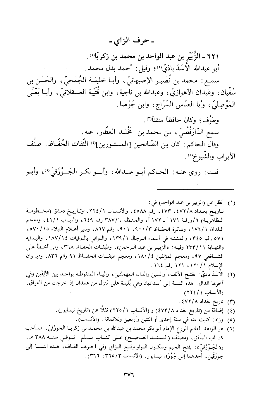 [6] هو الزاهد العالم الورع الإمام أبو بكر محمد بن عبد الله بن محمد بن زكريا الجوزقيّ، صاحب كتاب المتّفق، ومصنّف (المسند الصحيح) على كتاب مسلم. توفي سنة 388 هـ.