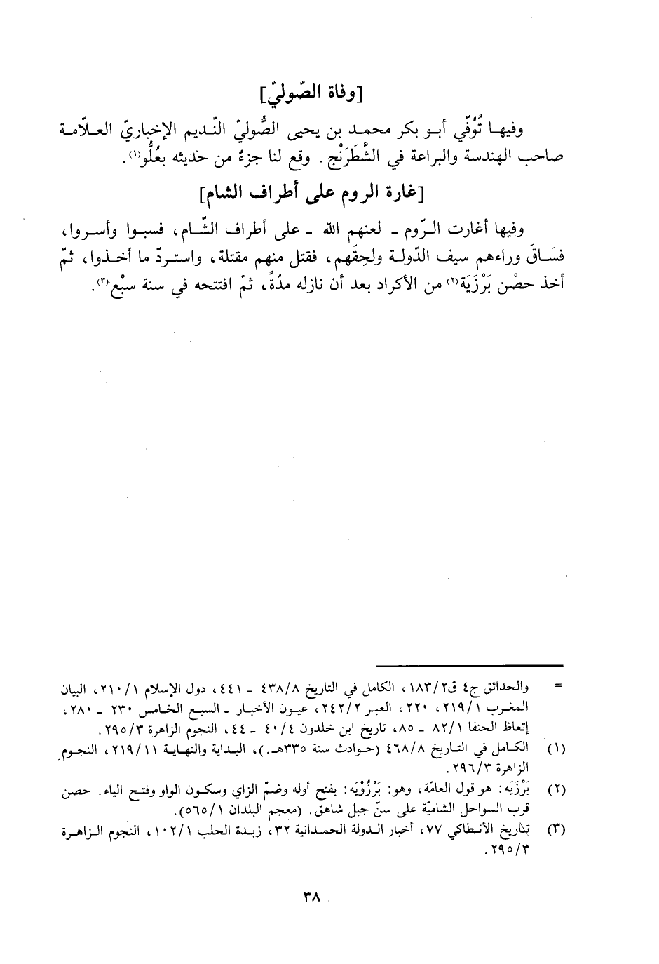 وفيها أغارت الروم- لعنهم الله- على أطراف الشّام، فسبوا وأسروا، فسَاقَ وراءهم سيف الدّولة ولِحقَهم، فقتل منهم مقتلة، واستردّ ما أخذوا، ثمّ أخذ حصْن بَرْزَيَة [2] من الأكراد بعد أن نازله مدّةً، ثمّ افتتحه في سنة سبع [3] .