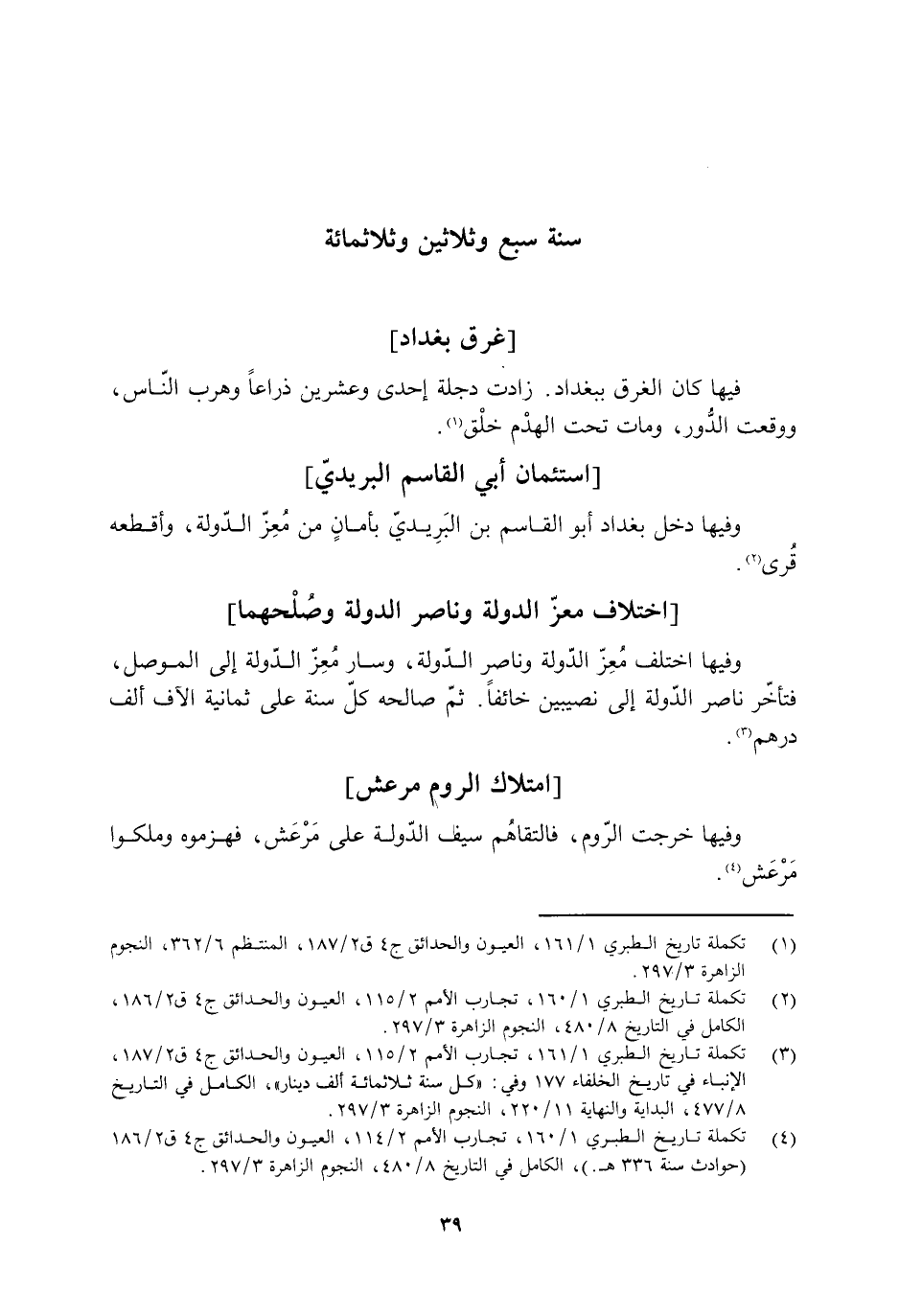 [4] تكملة تاريخ الطبري 1/ 160، تجارب الأمم 2/ 114، العيون والحدائق ج 4 ق 2/ 186 (حوادث سنة 336 هـ.) ، الكامل في التاريخ 8/ 480، النجوم الزاهرة 3/ 297.