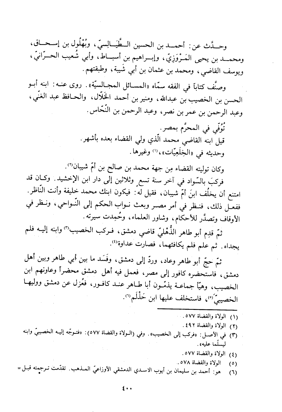 [3] في الأصل: «فركب إلى الخصيب» . وفي (الولاة والقضاة 577) : «فتوجّه إليه الخصيبيّ وابنه ليسلّما عليه» .