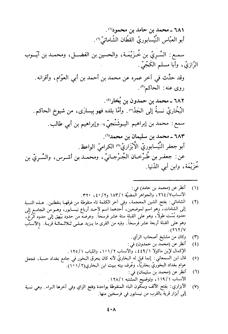 [2] الشاماتي: بفتح الشين المعجمة، وفي آخر الكلمة تاء منقوطة من فوقها بنقطتين. هذه النسبة إلى الشامات، وهو اسم لموضعين، أحدهما اسم لأحد أرباع نيسابور، وهو من الجامع إلى حدود بست طولا، وهو على القبلة ستة عشر فرسخا. وعرضه من حدود بيهق إلى حدود الرخّ، وهو على القبلة أربعة عشر فرسخا. وفيه من القرى ما يزيد على ثلاثمائة قرية. (الأنساب 7/ 262) .