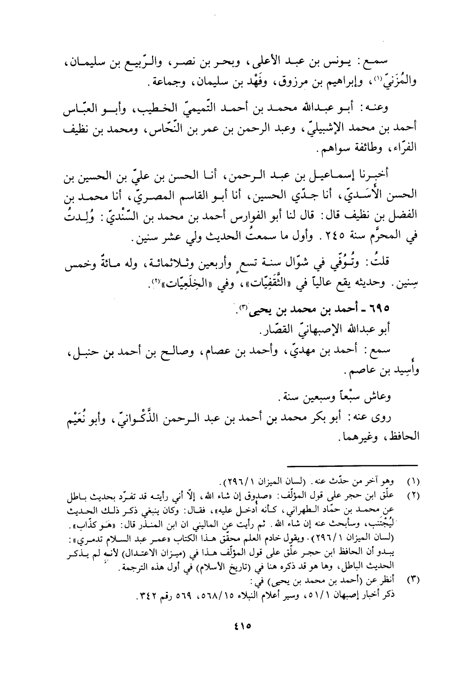 [2] علّق ابن حجر على قول المؤلّف: «صدوق إن شاء الله، إلّا أني رأيته قد تفرّد بحديث باطل عن محمد بن حمّاد الطهراني، كأنه أدخل عليه» ، فقال: وكان ينبغي ذكر ذلك الحديث ليجتنب، وسأبحث عنه إن شاء الله. ثم رأيت عن الماليني ان ابن المنذر قال: «هو كذّاب» .