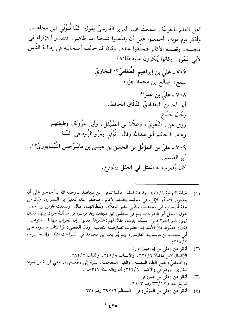 [1] غاية النهاية 1/ 476، وفيه تكملة: «ولما توفي ابن مجاهد- رحمه الله- أجمعوا على أن يقدّموه، فتصدَّر للإقراء فِي مجلسه وقصده الأكابر، فتحلّقوا عنده كعقيل بن البصري، وكان من جلّة أصحاب ابن مجاهد، وكأبي بكر الجلّاء، ونظرائهما، قال: وسمعت فارس بن أحمد يقول: دخل أبو طاهر ذات يوم في مجلس ابن مجاهد وقد فرغوا من مسألة جرت بينهم فقال لهم: فيم كنتم؟ قالوا: مسألة جرت، فقال لهم: هلمّوها. فقالوا: إن الجواب فيها قد استوعب فقال: هلمّوها فإنّ الأسد إذا حضرت تضارطت الثعالب. وقال القفطي: قرأ كتاب سيبويه على أبي محمد بن درستويه الفارسيّ، ولم ير بعد ابن مجاهد في القراءات مثله. (إنباه الرواة 2/ 215) .