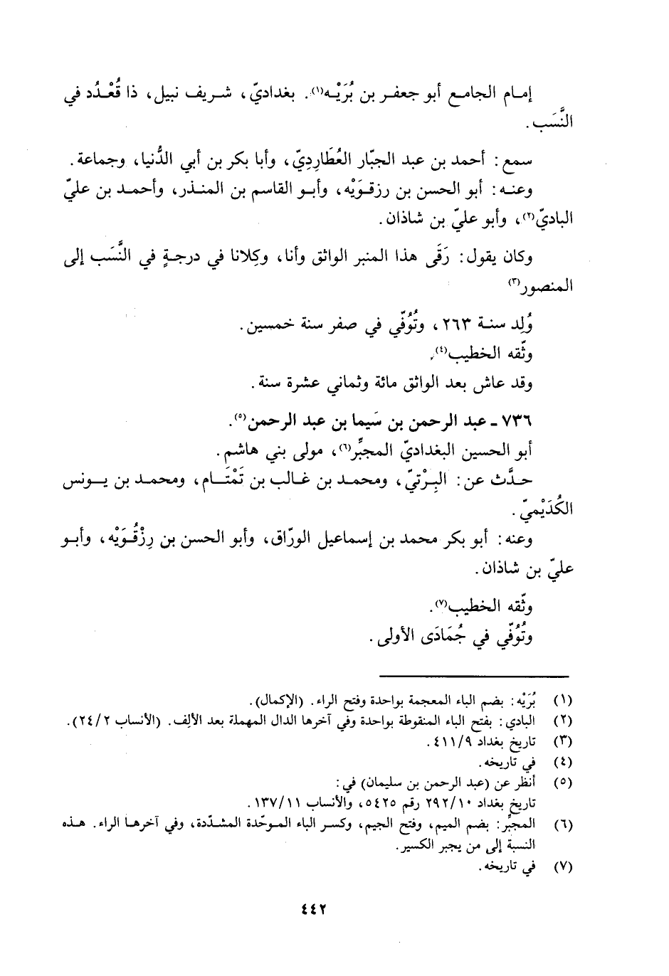 إمام الجامع أَبُو جعْفَر بْن بُرَيْه [1] . بغداديّ، شريف نبيل، ذا قُعْدُد فِي النسب.