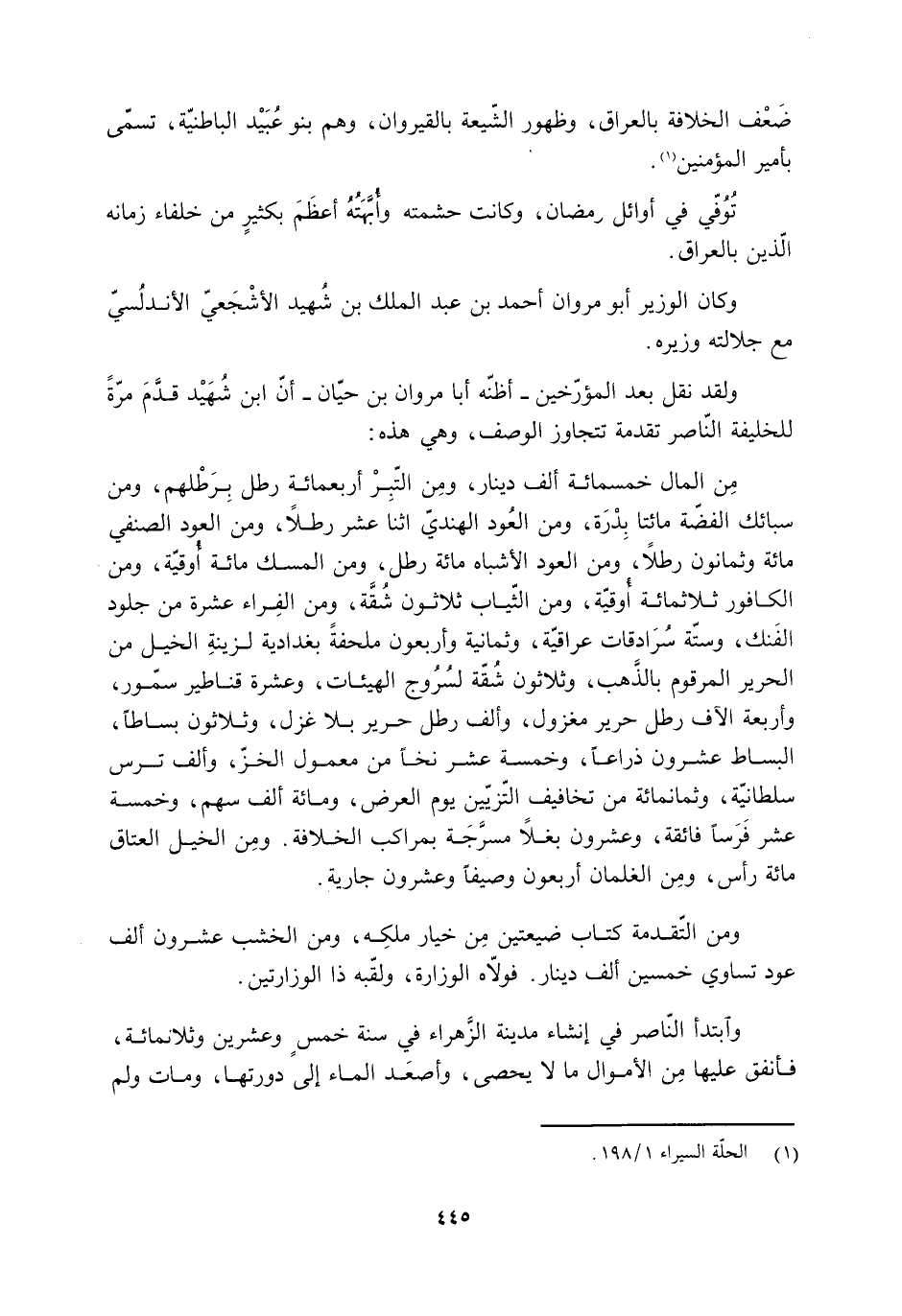 من المال خمسمائة ألف دينار، ومن التّبر أربعمائة رطل برطْلهم، ومن سبائك الفضة مائتا بدرة، ومن العود الهندي اثنا عشر رطلًا، ومن العود الصنفي مائة وثمانون رطلًا، ومن العود الأشباه مائة رطل، ومن المسك مائة أُوقية، ومن الكافور ثلاثمائة أُوقيّة، ومن الثّياب ثلاثون شُقَّة، ومن الفراء عشرة من جلود الفنك، وستة سُرادقات عراقية، وثمانية وأربعون ملحفةً بغدادية لزينة الخيل من الحرير المرقوم بالذهب، وثلاثون شُقَّة لسُرُوج الهيئات، وعشرة قناطير سمّور، وأربعة آلاف رطل حرير مغزول، وألف رطل حرير بلا غزل، وثلاثون بساطًا، البساط عشرون ذراعًا، وخمسة عشر نخًا من معمول الخزّ، وألف ترس سلطانيّة، وثمانمائة من تخافيف التّزّيين يوم العرض، ومائة ألف سهم، وخمسة عشر فَرَسًا فائقة، وعشرون بغلًا مسرَّجة بمراكب الخلافة. ومن الخيل العتاق مائة رأس، ومن الغلمان أربعون وصيفًا وعشرون جارية.