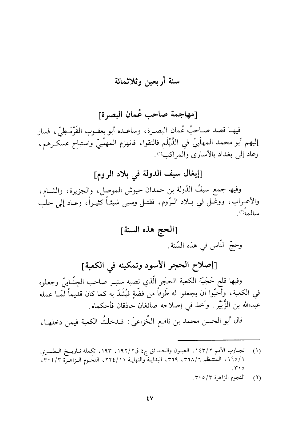 [1] تجارب الأمم 2/ 143، العيون والحدائق ج 4 ق 2/ 192، 193، تكملة تاريخ الطبري 1/ 165، المنتظم 6/ 368، 369، البداية والنهاية 11/ 224، النجوم الزاهرة 3/ 304، 305.