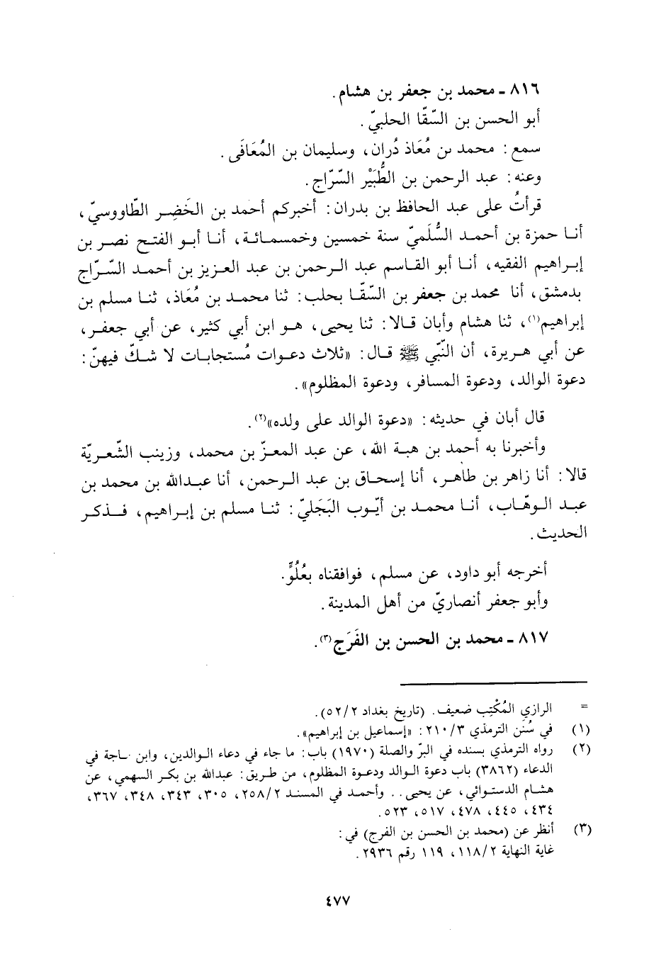 قَرَأْتُ عَلَى عَبْدِ الْحَافِظِ بْنِ بَدْرَانَ: أَخْبَرَكُمْ أحمد بن الخضر الطّاووسيّ، أَنَا حَمْزَةُ بْنُ أَحْمَدَ السُّلَمِيُّ سنة خَمْسِينَ وَخَمْسِمِائَةٍ، أَنَا أَبُو الْفَتْحِ نَصْرُ بْنُ إِبْرَاهِيمَ الْفَقِيهُ، أَنَا أَبُو الْقَاسِمِ عَبْدُ الرَّحْمَنِ بْنُ عَبْدِ الْعَزِيزِ بْنِ أَحْمَدَ السَّرَّاجُ بِدِمَشْقَ، أَنَا محمد بن جعفر بن السّقّاء بِحَلَبٍ: ثَنَا محمد بْنُ مُعَاذٍ، ثَنَا مُسْلِمُ بْنُ إِبْرَاهِيمَ [1] ، ثَنَا هِشَامٌ وَأَبَانٌ قَالَا: ثنا يَحْيَى، هُوَ ابْنُ أَبِي كَثِيرٍ، عَنْ أَبِي جَعْفَرٍ، عَنْ أَبِي هُرَيْرَةَ، أَنَّ النَّبِيَّ صَلَّى اللَّهُ عَلَيْهِ وَسَلَّمَ قالَ: «ثَلَاثُ دَعَوَاتٍ مُسْتَجَابَاتٌ لَا شَكَّ فِيهِنَّ: