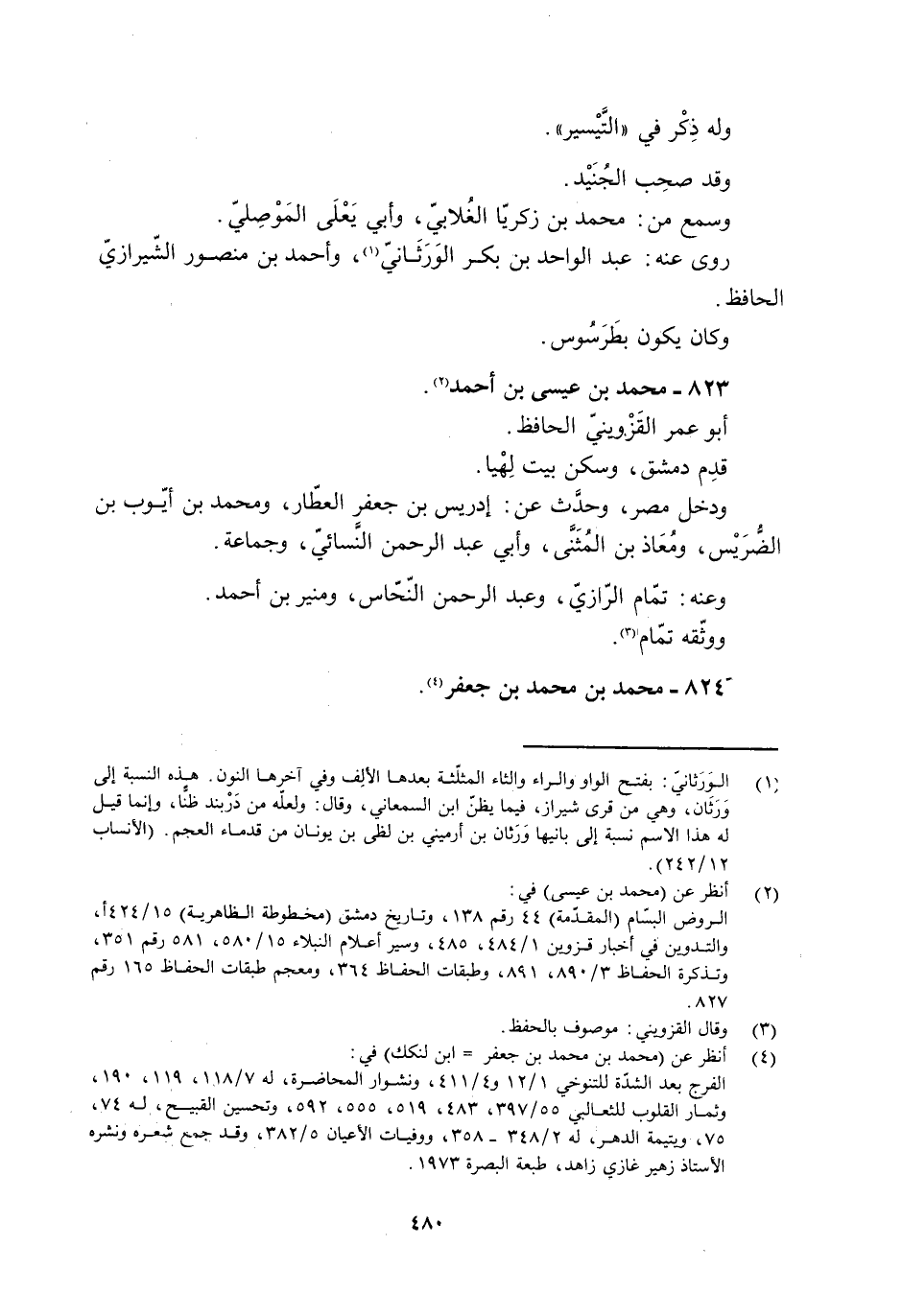 [1] الورثانيّ: بفتح الواو والراء والثاء المثلّثة بعدها الألف وفي آخرها النون. هذه النسبة إلى ورثان، وهي من قرى شيراز، فيما يظنّ ابن السمعاني، وقال: ولعلّه من دربند ظنّا، وإنما قيل له هذا الاسم نسبة إلى بانيها ورثان بن أرميني بن لظى بن يونان من قدماء العجم. (الأنساب 12/ 242) .