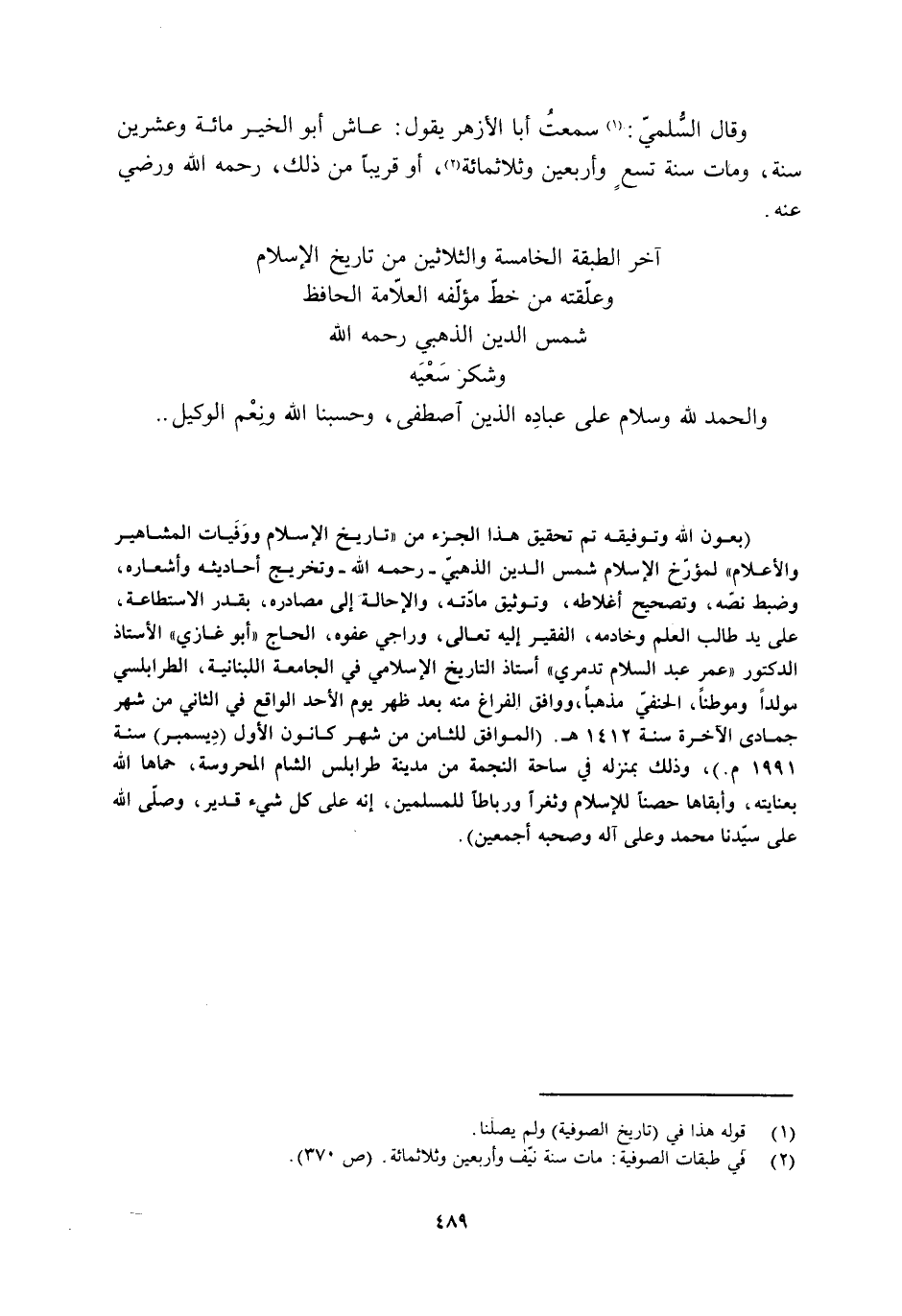 (بعون الله وتوفيقه تم تحقيق هذا الجزء من «تاريخ الإسلام ووفيات المشاهير والأعلام» لمؤرّخ الإسلام شمس الدين الذهبيّ- رحمه الله- وتخريج أحاديثه وأشعاره، وضبط نصّه، وتصحيح أغلاطه، وتوثيق مادّته، والإحالة إلى مصادره، بقدر الاستطاعة، على يد طالب العلم وخادمه، الفقير إليه تعالى، وراجي عفوه، الحاج «أبو غازي» الأستاذ الدكتور «عمر عبد السلام تدمري» أستاذ التاريخ الإسلامي في الجامعة اللبنانية، الطرابلسي مولدا وموطنا، الحنفيّ مذهبا، ووافق الفراغ منه بعد ظهر يوم الأحد الواقع في الثاني من شهر جمادى الآخرة سنة 1412 هـ. (الموافق للثامن من شهر كانون الأول (ديسمبر) سنة 1991 م.) ، وذلك بمنزله في ساحة النجمة من مدينة طرابلس الشام المحروسة، حماها الله بعنايته، وأبقاها حصنا للإسلام وثغرا ورباطا للمسلمين، إنه على كل شيء قدير، وصلّى الله على سيّدنا محمد وعلى آله وصحبه أجمعين) .