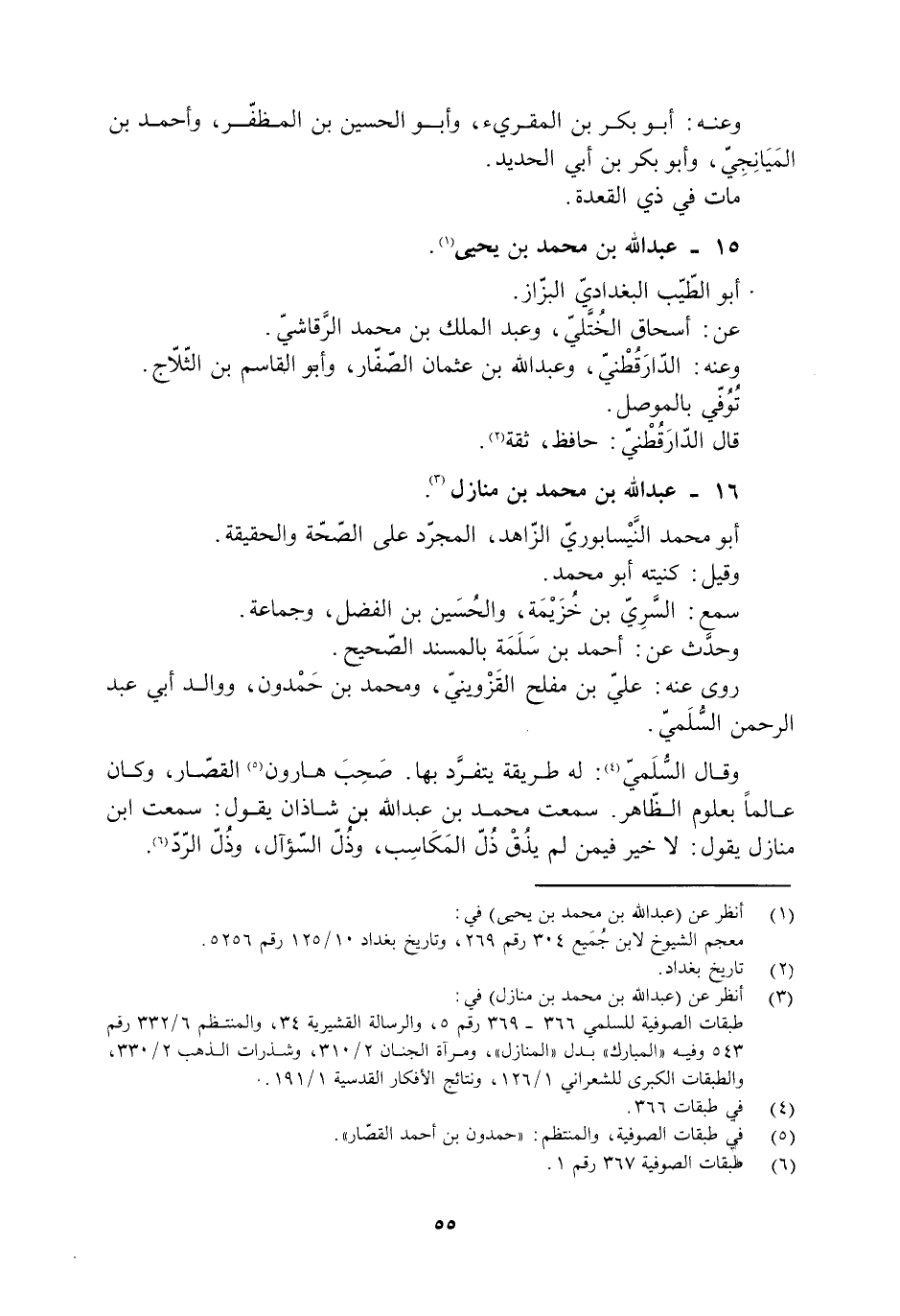 طبقات الصوفية للسلمي 366- 369 رقم 5، والرسالة القشيرية 34، والمنتظم 6/ 332 رقم 543 وفيه «المبارك» بدل «المنازل» ، ومرآة الجنان 2/ 310، وشذرات الذهب 2/ 330، والطبقات الكبرى للشعراني 1/ 126، ونتائج الأفكار القدسية 1/ 191.
