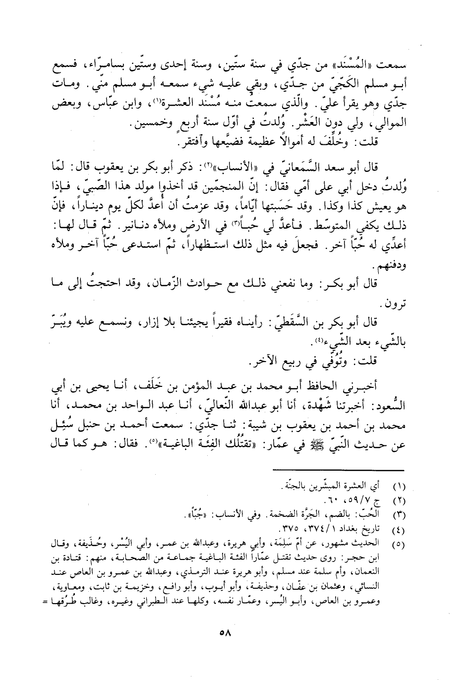 سمعت «المسند» من جدّي في سنة ستين، وسنة إحدى وستين بسامراء، فسمع أبو مسلم الكَجيّ من جدّي، وبقي عليه شيء سمعه أبو مسلم مني. ومات جدّي وهو يقرأ عليّ. والذي سمعت منه مُسنَدَ العشرة [1] ، وابن عبّاس، وبعض الموالي، ولي دون العشر. ولدت في أول سنة أربع وخمسين.