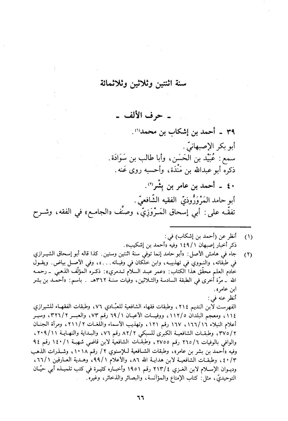 [2] جاء في هامش الأصل: «أبو حامد إنما توفي سنة اثنتين وستين. كذا قاله أبو إسحاق الشيرازي في طبقاته، والنووي في تهذيبه، وابن خلكان في وفياته ... » ، وفي الأصل بياض. ويقول خادم العلم محقّق هذا الكتاب: «عمر عبد السلام تدمري» : ذكره المؤلّف الذهبي- رحمه الله- مرّة أخرى في الطبقة السادسة والثلاثين، وفيات سنة 362 هـ. باسم: «أحمد بن بشر ابن عامر» .
