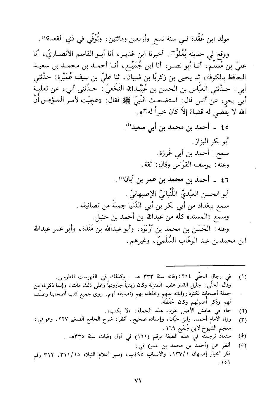 وَوَقَعَ لِي حَدِيثُهُ بِعُلُوٍّ [2] . أَخْبَرَنَا ابْنُ غَدِيرٍ، أَنَا أَبُو الْقَاسِمِ الْأَنْصَارِيُّ، أَنَا عَلِيُّ بْنُ مُسْلِمٍ، أَنَا أَبُو نَصْرٍ، أَنَا ابْنُ جُمَيْعٍ، أَنَا أَحْمَدُ بْنُ محمد بْنِ سَعِيدٍ الْحَافِظُ بِالْكُوفَةِ، ثَنَا يَحْيَى بْنُ زَكَرِيَّا بْنِ شَيْبَانَ، ثَنَا عَلِيُّ بْنُ سَيْفِ عُمَيْرَةَ: حَدَّثَنِي أَبِي: حَدَّثَنِي الْعَبَّاسُ بْنُ الْحَسَنِ بْنِ عُبَيْدِ اللَّهِ النَّخَعِيُّ: حَدَّثَنِي أَبِي، عَنْ ثَعْلَبَةَ أَبِي بَحْرٍ، عَنْ أَنَسٍ قال: استضحك النّبيّ صلّى الله عليه وآله وَسَلَّمَ فَقَالَ: «عَجِبْتُ لِأَمْرِ الْمُؤْمِنِ أَنَّ اللَّهَ لَا يَقْضِي لَهُ قَضَاءً إِلَّا كَانَ خَيْرًا لَهُ [3] » . 45- أحمد بن محمد بن أبي سعيد [4] .
