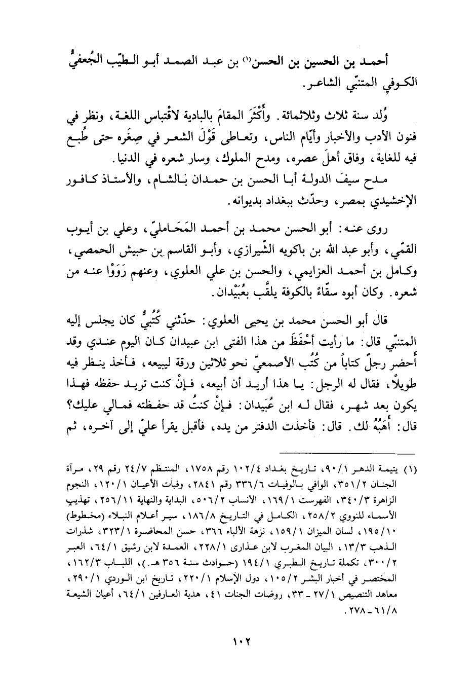 [1] يتيمة الدهر 1/ 90، تاريخ بغداد 4/ 102 رقم 1758، المنتظم 7/ 24 رقم 29، مرآة الجنان 2/ 351، الوافي بالوفيات 6/ 336 رقم 2841، وفيات الأعيان 1/ 120، النجوم الزاهرة 3/ 340، الفهرست 1/ 169، الأنساب 2/ 506، البداية والنهاية 11/ 256، تهذيب الأسماء للنووي 2/ 258، الكامل في التاريخ 8/ 186، سير أعلام النبلاء (مخطوط) 10/ 195، لسان الميزان 1/ 159، نزهة الألباء 366، حسن المحاضرة 1/ 323، شذرات الذهب 3/ 13، البيان المغرب لابن عذارى 1/ 228، العمدة لابن رشيق 1/ 64، العبر 2/ 300، تكملة تاريخ الطبري 1/ 194 (حوادث سنة 356 هـ.) ، اللباب 3/ 162، المختصر في أخبار البشر 2/ 105، دول الإسلام 1/ 220، تاريخ ابن الوردي 1/ 290، معاهد التنصيص 1/ 27- 33، روضات الجنات 41، هدية العارفين 1/ 64، أعيان الشيعة 8/ 61- 278.