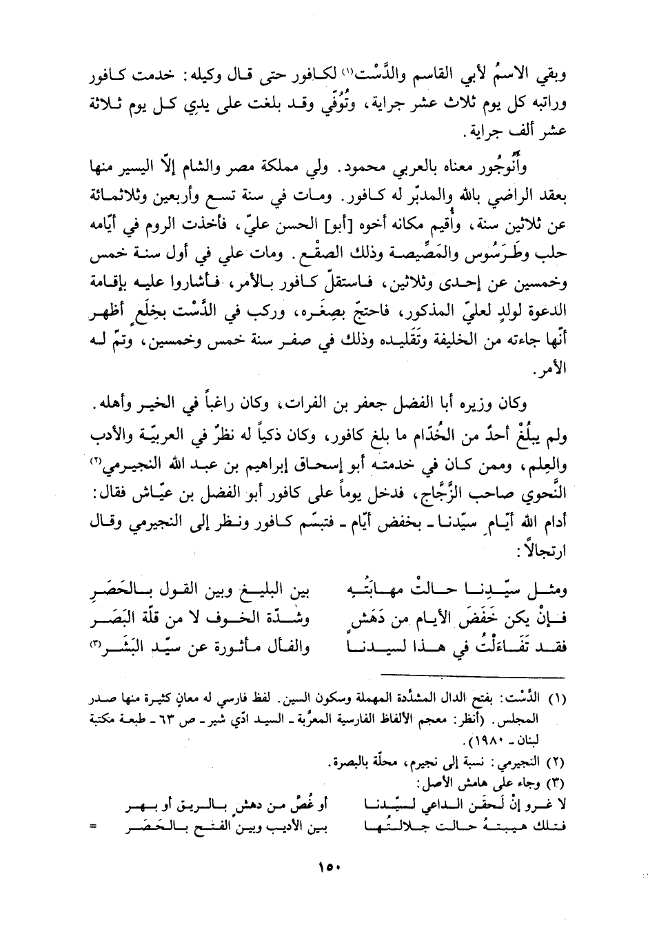 ولم يبلُغْ أحدٌ من الخُدّام ما بلغ كافور، وكان ذكيًا له نظرٌ في العربيّة والأدب والعِلم، وممن كان في خدمته أبو إسحاق إبراهيم بن عبد الله النجيرمي [2] النَّحوي صاحب الزَّجَّاج، فدخل يومًا على كافور أبو الفضل بن عيّاش فقال: