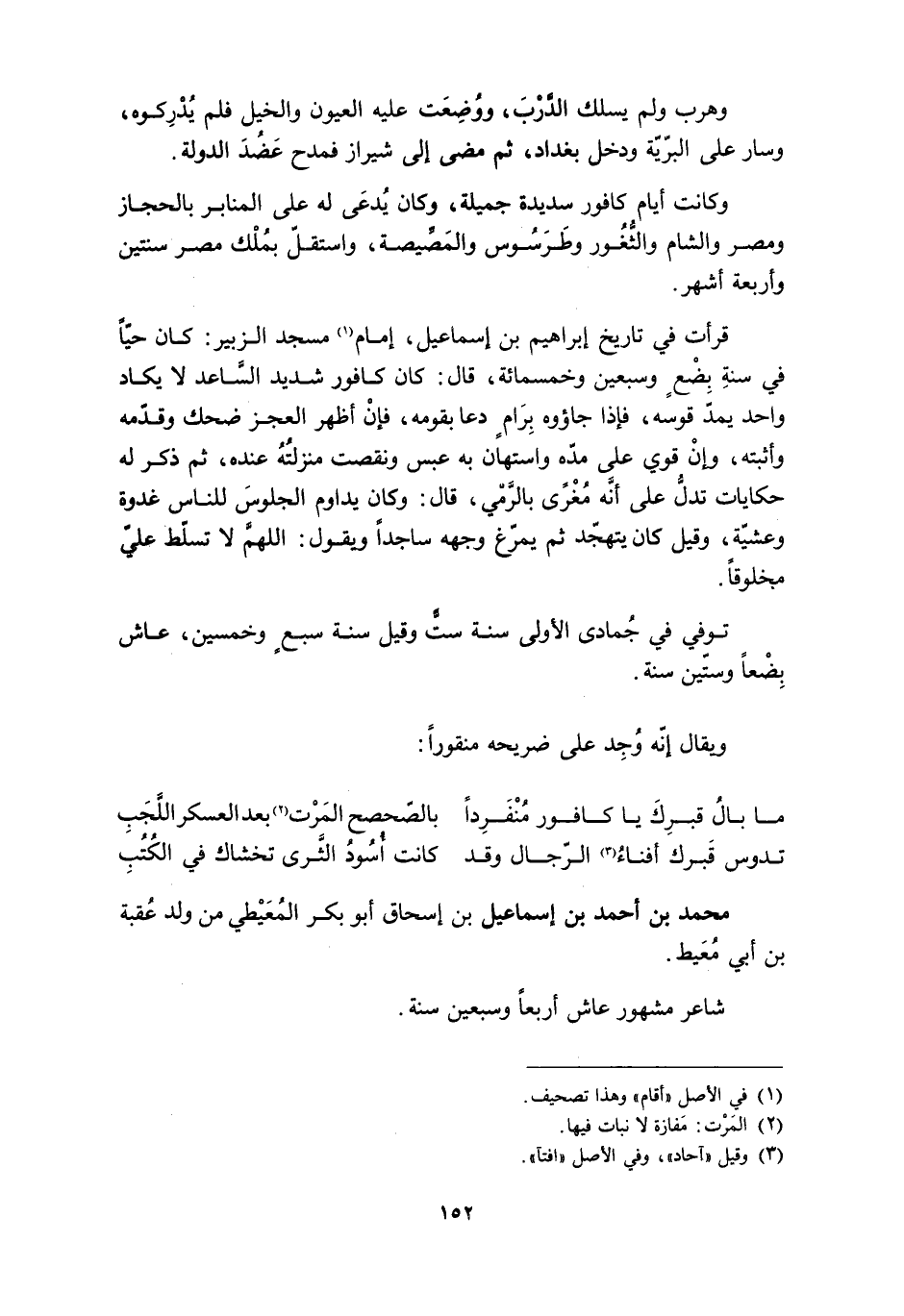 قرأت في تاريخ إبراهيم بن إسماعيل، إمام [1] مسجد الزبير: كان حيًّا في سنة بضع وسبعين وخمسمائة، قال: كان كافور شديد السَّاعد لا يكاد واحد يمدّ قوسه، فإذا جاءوه بِرَام دعا بقومه، فإنّ أظهر العجز ضحك وقدّمه وأثبته، وإنْ قوى على مدّه واستهان به عبس ونقصت منزلتُه عنده، ثم ذكر له حكايات تدلّ على أنَّه مُغْرًى بالرَّمْي، قال: وكان يداوم الجلوسَ للناس غدوة وعشيّة، وقيل كان يتهجّد ثم يمرّغ وجهه ساجدًا ويقول: اللَّهمّ لا تسلّط عليّ مخلوقًا.
