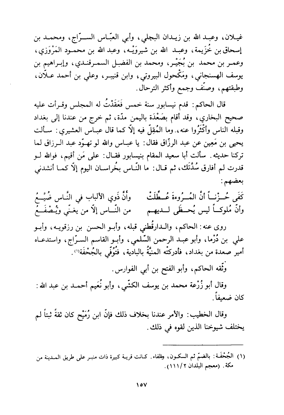 قال الحاكم: قدم نيسابور سنة خمس فَعَقَدْتُ له المجلس وقرأت عليه صحيح البخاري، وقد أقام بصَعْدَة باليمن مدّة، ثم خرج من عندنا إلى بغداد وقبله الناس وأكْثَرُوا عنه، وما المُقِلّ فيه إلّا كما قال عباس العشيري: سألت يحيى بن مَعين عن عبد الرزّاق فقال: يا عباس والله لو تهوّد عبد الرزاق لما تركنا حديثه. سألت أبا سعيد المقام بنيسابور فقال: على من أقيم، فو الله لو قدرت لم أفارق سُدَّتَك، ثم قال: ما النّاس بخُراسان اليوم إلّا كما أنشدني بعضهم: