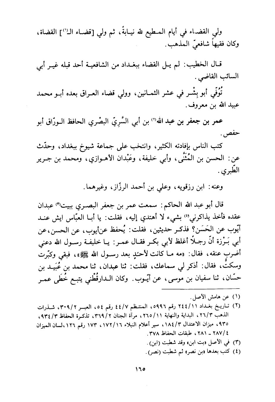 قال أبو عبد الله الحاكم: سمعت عمر بن جعفر البصري ببيت [3] عبدان عقده فأخذ يذاكرني [4] بشيء لا أهتدي إليه، فقلت: يا أبا العبّاس أيش عند أيّوب عن الحَسَن؟ فذكر حديثين، فَقُلْتُ: يُحْفَظُ عَنْ أَيُّوبَ، عَنِ الْحَسَنِ، عَنْ أَبِي بَرْزَةَ أَنَّ رَجُلا أَغْلَظَ لأَبِي بَكْرٍ فَقَالَ عُمَرُ: يَا خَلِيفَةَ رَسُولِ اللَّهِ دَعْنِي أَضْرِبُ عُنُقَهُ، فَقَالَ: «مَهٍ مَا كَانَتْ لأَحَدٍ بَعْدَ رَسُولِ اللَّهِ صَلَّى اللَّهُ عَلَيْهِ وَسَلَّمَ» ، فَبَقِيَ وَكَبَّرْتُ وَسَكَتُّ، فَقَالَ: اذْكُرْ لِي سَمَاعَكَ، فَقُلْتُ: ثنا عَبْدَانُ، ثنا محمد بْنُ عُبَيْدِ بْنِ حَسَّانٍ، ثنا سُفْيَانُ بْنُ مُوسَى، عن أيّوب. وكان الدار الدّارقطنيّ يتبع خطى عمر