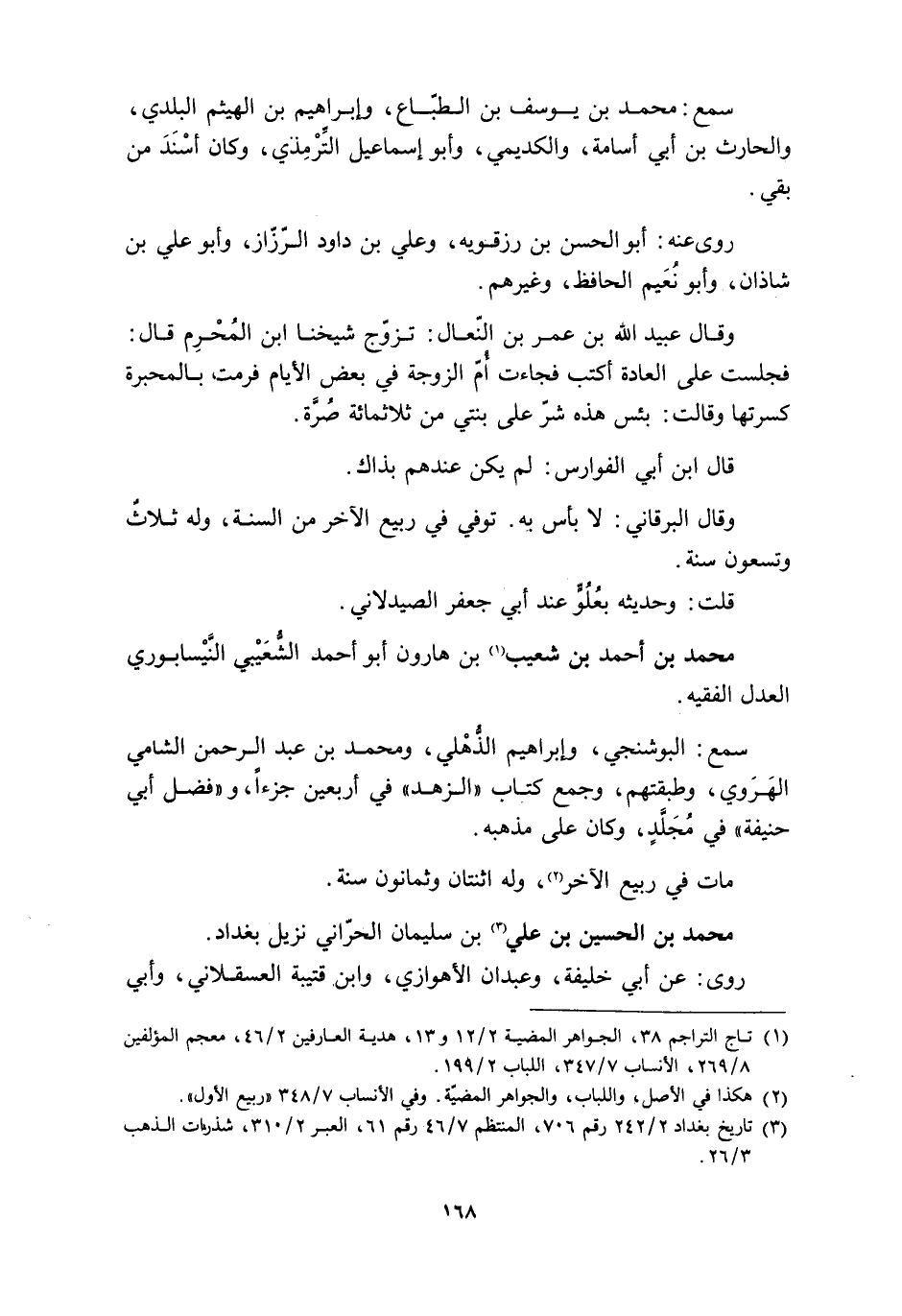 [3] تاريخ بغداد 2/ 242 رقم 706، المنتظم 7/ 46 رقم 61، العبر 2/ 310، شذرات الذهب 3/ 26.