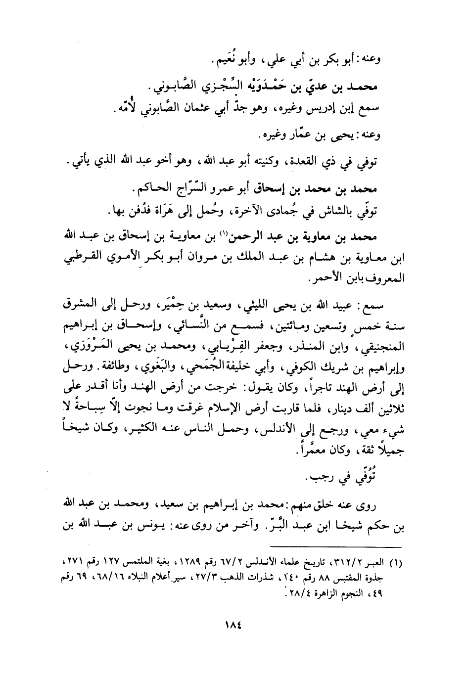 [1] العبر 2/ 312، تاريخ علماء الأندلس 2/ 67 رقم 1289، بغية الملتمس 127 رقم 271، جذوة المقتبس 88 رقم 140، شذرات الذهب 3/ 27، سير أعلام النبلاء 16/ 68، 69 رقم 49، النجوم الزاهرة 4/ 28.