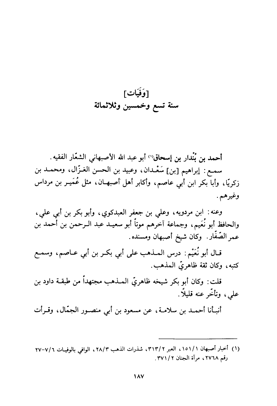 [1] أخبار أصبهان 1/ 151، العبر 2/ 313، شذرات الذهب 3/ 28، الوافي بالوفيات 6/ 7- 27 رقم 2768، مرآة الجنان 2/ 371.