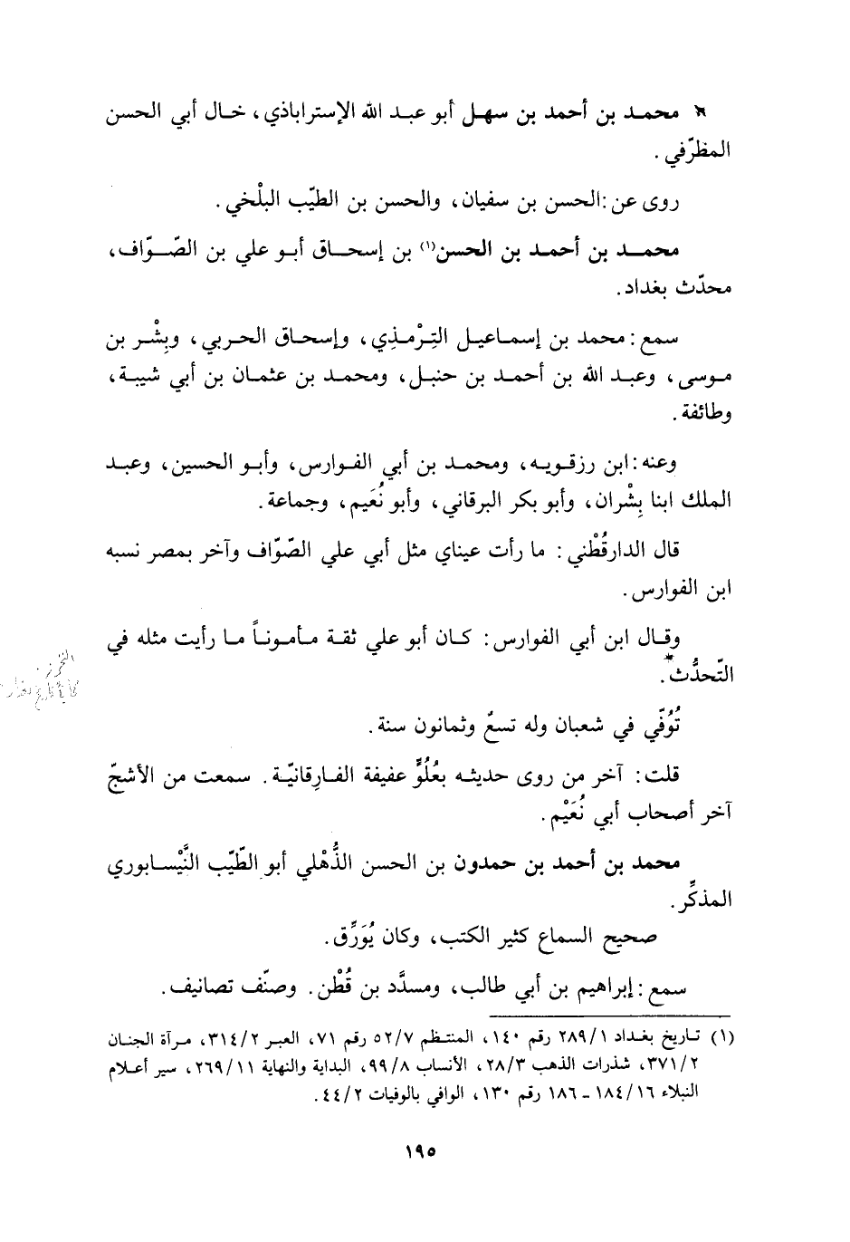 [1] تاريخ بغداد 1/ 289 رقم 140، المنتظم 7/ 52 رقم 71، العبر 2/ 314، مرآة الجنان 2/ 371، شذرات الذهب 3/ 28، الأنساب 8/ 99، البداية والنهاية 11/ 269، سير أعلام النبلاء 16/ 184- 186 رقم 130، الوافي بالوفيات 2/ 44.