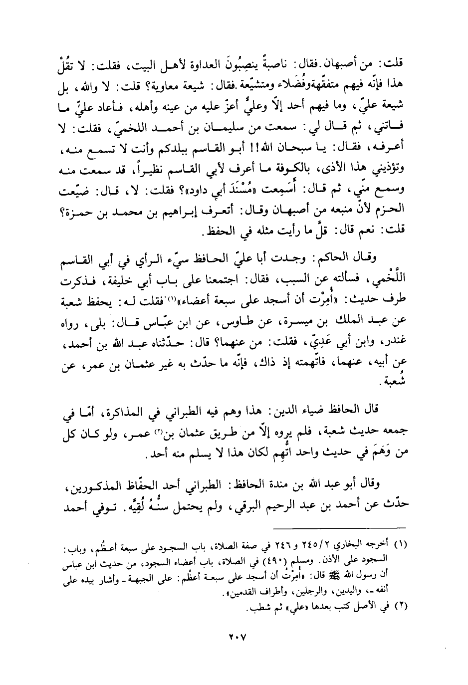 قلت: من أصبهان. فقال: ناصبةً ينصِبُونَ العداوة لأهل البيت، فقلت: لا تقُلْ هذا فإنّه فيهم متفقّهة وفُضلاء ومتشيّعة. فقال: شيعة معاوية؟ قلت: لا والله، بل شيعة عليّ، وما فيهم أحد إلّا وعليّ أعزّ عليه من عينه وأهله، فأعاد عليّ ما فاتني، ثم قال لي: سمعت من سليمان بن أحمد اللخميّ، فقلت: لا أعرفه، فقال: يا سبحان الله!! أبو القاسم ببلدكم وأنت لا تسمع منه، وتؤذيني هذا الأذى، بالكوفة ما أعرف لأبي القاسم نظيرا، قد سمعت منه وسمع منّي، ثم قال: أَسَمعِت «مُسْنَدَ أبي داود» ؟ فقلت: لا، قال: ضيّعت الحزم لأن منبعه من أصبهان وقال: أتعرف إبراهيم بن محمد بن حمزة؟
