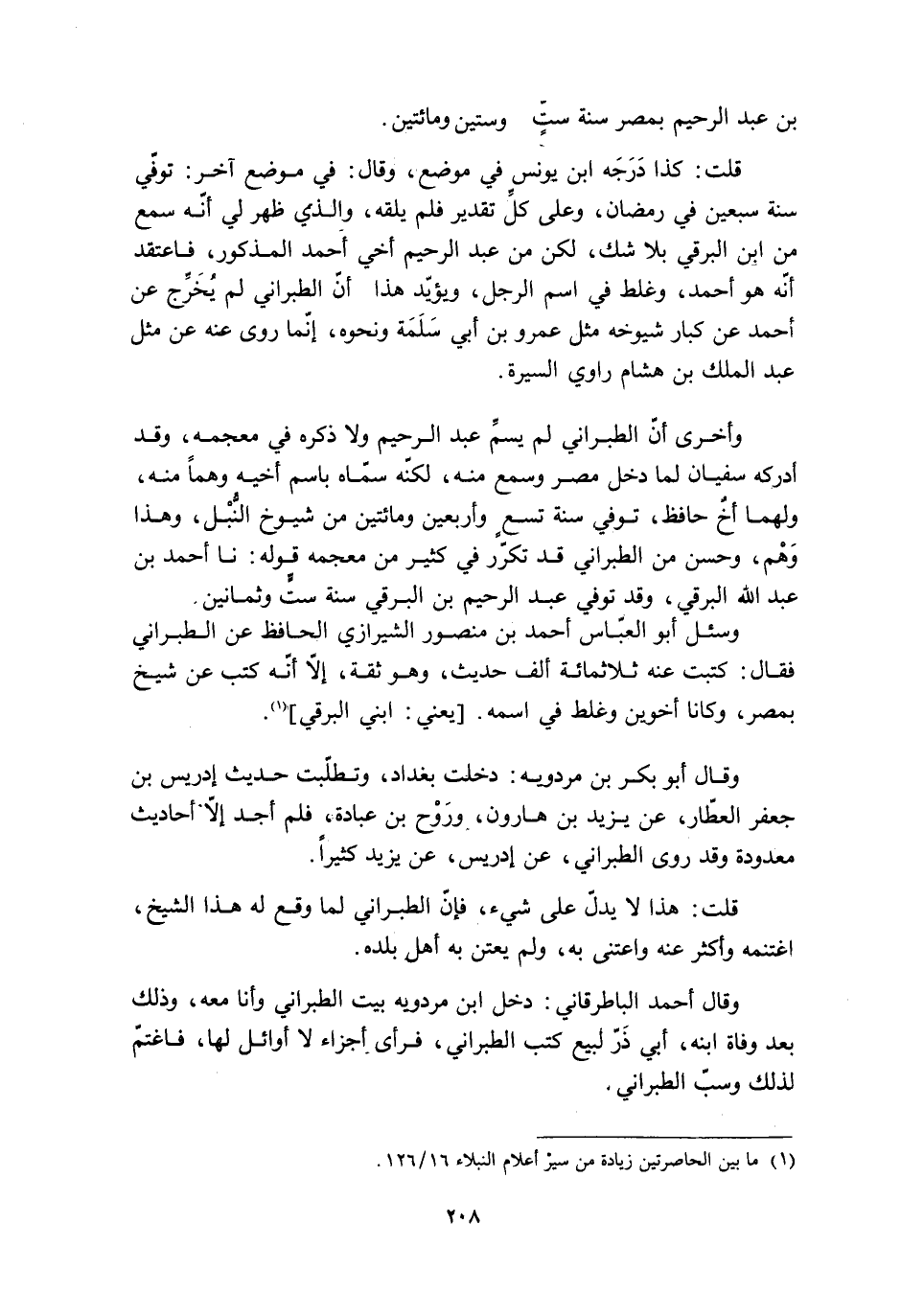 وأخرى أنّ الطبراني لم يسمّ عبد الرحيم ولا ذكره في معجمه، وقد أدركه سفيان لما دخل مصر وسمع منه، لكنّه سمّاه باسم أخيه وهمًا منه، ولهما أخٌ حافظ، تُوُفّي سنة تسعٍ وأربعين ومائتين من شيوخ النّبْل، وهذا وَهْم، وحسن من الطبراني قد تكرّر في كثير من معجمه قوله: نا أحمد بن عبد الله البرقي، وقد تُوُفّي عبد الرحيم بن البرقي سنة ستَّ وثمانين.