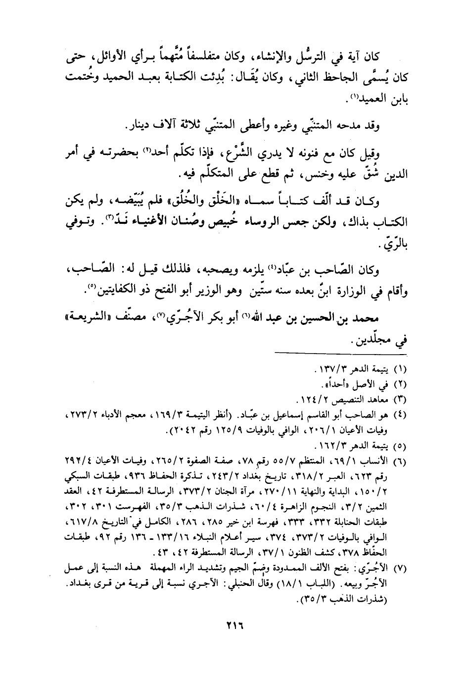 [4] هو الصاحب أبو القاسم إسماعيل بن عبّاد. (انظر اليتيمة 3/ 169، معجم الأدباء 2/ 273، وفيات الأعيان 1/ 206، الوافي بالوفيات 9/ 125 رقم 2042) .