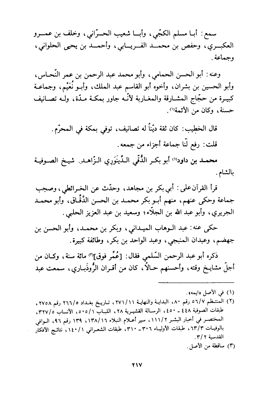 [2] المنتظم 7/ 56 رقم 80، البداية والنهاية 11/ 271، تاريخ بغداد 5/ 266 رقم 2758، طبقات الصوفية 448- 450، الرسالة القشيرية 28، اللباب 1/ 505، الأنساب 5/ 327، المختصر في أخبار البشر 2/ 111، سير أعلام النبلاء 16/ 138، 139 رقم 96، الوافي بالوفيات 3/ 63، طبقات الأولياء 306- 310، طبقات الشعراني 1/ 140، نتائج الأفكار القدسية 2/ 3.