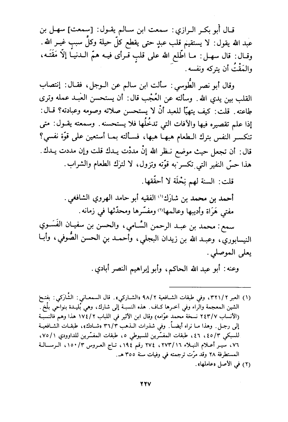 [1] العبر 2/ 321، وفي طبقات الشافعية 2/ 98 «الشاركي» . قال السمعاني: الشّاركي: بفتح الشين المعجمة والراء وفي آخرها كاف. هذه النسبة إلى شارك، وهي بليدة بنواحي بلخ.