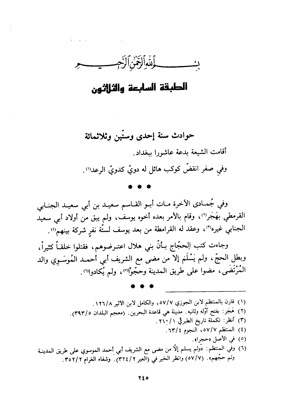 [6] وفي المنتظم: «ولم يَسْلَم إلا من مضى مع الشريف أبي أحمد الموسوي على طريق المدينة وتم حجّهم» . (7/ 57) وانظر الخبر في (العير 2/ 324) . وشفاء الغرام 2/ 352.
