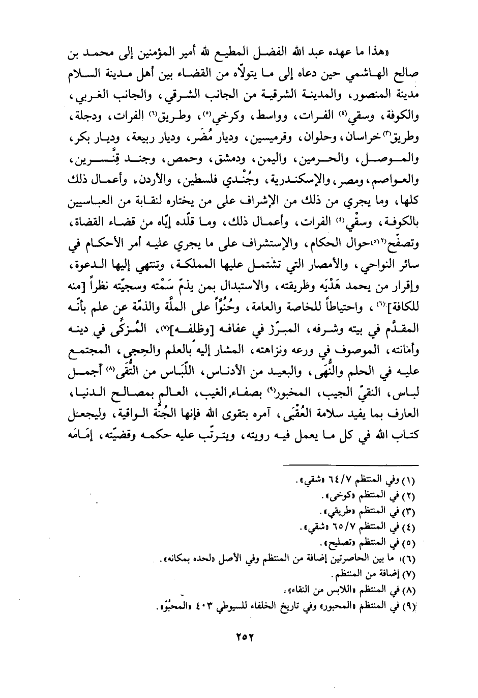 «هذا ما عهده عبد الله الفضل المطيع للَّه أمير المؤمنين إلى محمد بن صالح الهاشمي حين دعاه إلى ما يتولاه من القضاء بين أهل مدينة السلام مدينة المنصور، والمدينة الشرقية من الجانب الشرقي، والجانب الغربي، والكوفة، وسقي [1] الفرات، وواسط، وكرخي [2] ، وطريق [3] الفرات، ودجلة، وطريق [3] خراسان، وحلوان، وقرميسين، وديار مُضَر، وديار ربيعة، وديار بكر، والموصل، والحرمين، واليمن، ودمشق، وحمص، وجند قِنَّسرين، والعواصم، ومصر، والإسكندرية، وجُنْدي فلسطين، والأردن، وأعمال ذلك كلها، وما يجري من ذلك من الإشراف على من يختاره لنقابة من العباسيين بالكوفة، وسقْي [4] الفرات، وأعمال ذلك، وما قلّده إيّاه من قضاء القضاة، وتصفّح [5] حوال الحكام، والاستشراف على ما يجري عليه أمر الأحكام في سائر النواحي، والأمصار التي تشتمل عليها المملكة، وتنتهي إليها الدعوة، وإقرار من يحمد هَدْيَه وطريقته، والاستبدال بمن يذمّ سَمْته وسجيّته نظرًا [منه للكافة] [6] ، واحتياطًا للخاصة والعامة، وحُنُوًّا على الملّة والذمّة عن علم بأنّه المقدّم في بيته وشرفه، المبرّز في عفافه [وظلفه] [7] ، المُزكّي في دينه وأمانته، الموصوف في ورعه ونزاهته، المشار إليه بالعلم والحِجى، المجتمع عليه في الحلم والنُّهَى، والبعيد من الأدناس، اللّبَاس من التُّقَى [8] أجمل لباس، النقيّ الجيب، المخبور [9] بصفاء الغيب، العالم بمصالح الدنيا، العارف بما يفيد سلامة العُقْبَى، آمره بتقوى الله فإنها الْجُنّة الواقية، وليجعل كتاب الله في كل ما يعمل فيه رويته، ويترتّب عليه حكمه وقضيّته، إمَامَه