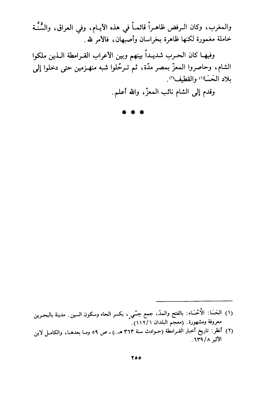 وفيها كان الحرب شديدًا بينهم وبين الأعراب القرامطة الذين ملكوا الشام، وحاصروا المعزّ بمصر مدّة، ثم ترحّلوا شبه منهزمين حتى دخلوا إلى بلاد الحَسَا [1] والقطيف [2] .