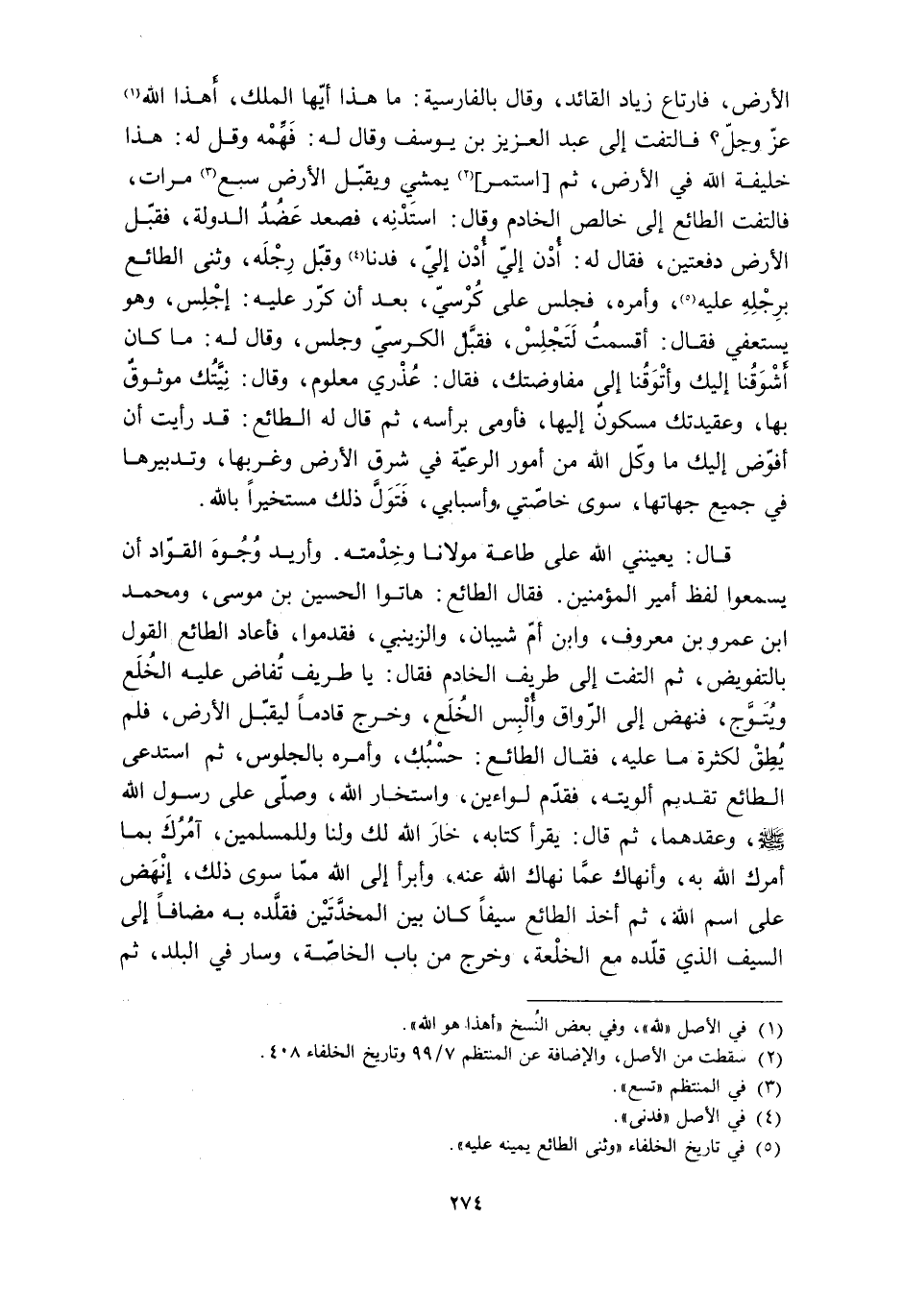 الأرض، فارتاع زياد القائد، وقال بالفارسية: ما هذا أيّها الملك، أهذا الله [1] عزّ وجلّ؟ فالتفت إلى عبد العزيز بن يوسف وقال له: فَهّمْه وقل له: هذا خليفة الله في الأرض، ثم [استمر] [2] يمشي ويقبّل الأرض سبع [3] مرات، فالتفت الطائع إلى خالص الخادم وقال: استَدنِه، فصعد عضُدُ الدولة، فقبّل الأرض دفعتين، فقال له: أدْن إليّ أدْن إليّ، فدنا [4] وقبّل رجْلَه، وثنى الطائع برِجْله عليه [5] ، وأمره، فجلس على كُرْسيّ، بعد أن كرّر عليه: اجْلس، وهو يستعفي فقال: أقسمتُ لَتَجلِسْ، فقبّل الكرسيّ وجلس، وقال له: ما كان أَشْوَقُنا إليك وأَتْوَقُنا إلى مفاوضتك، فقال: عُذْري معلوم، وقال: نِيّتُك موثوقٌ بها، وعقيدتك مسكونّ إليها، فأومى برأسه، ثم قال له الطائع: قد رأيت أن أفوّض إليك ما وكّل الله من أمور الرعيّة في شرق الأرض وغربها، وتدبيرها في جميع جهاتها، سوى خاصّتي وأسبابي، فَتَوَلَّ ذلك مستخيرًا باللَّه.